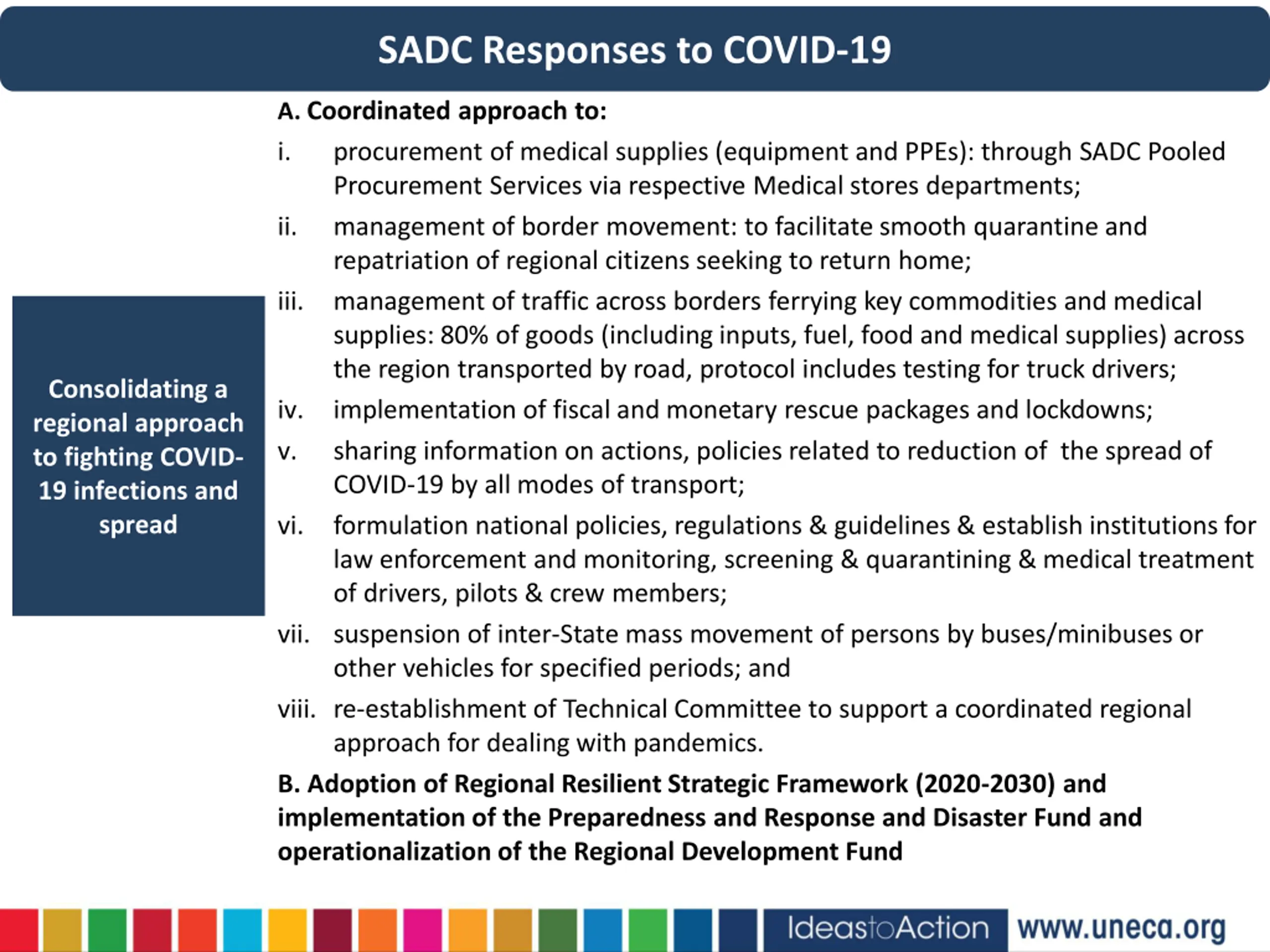 SADC Responses to COVID-19 A. Coordinated approach to: i. procurement of medical supplies (equipment and PPEs): through SADC Pooled Procurement Services via respective Medical stores departments; ii. management of border movement: to facilitate smooth quarantine and repatriation of regional citizens seeking to return home; iii. management of traffic across borders ferrying key commodities and medical supplies: 80% of goods (including inputs, fuel, food and medical supplies) across the region transported by road, protocol includes testing for truck drivers; iv. implementation of fiscal and monetary rescue packages and lockdowns; v. sharing information on actions, policies related to reduction of the spread of COVID-19 by all modes of transport; vi. formulation national policies, regulations & guidelines & establish institutions for law enforcement and monitoring, screening & quarantining & medical treatment of drivers, pilots & crew members; vii. suspension of inter-State mass movement of persons by buses/minibuses or other vehicles for specified periods; and viii. re-establishment of Technical Committee to support a coordinated regional approach for dealing with pandemics. B. Adoption of Regional Resilient Strategic Framework (2020-2030) and implementation of the Preparedness and Response and Disaster Fund and operationalization of the Regional Development Fund Consolidating a regional approach to fighting COVID- 19 infections and spread