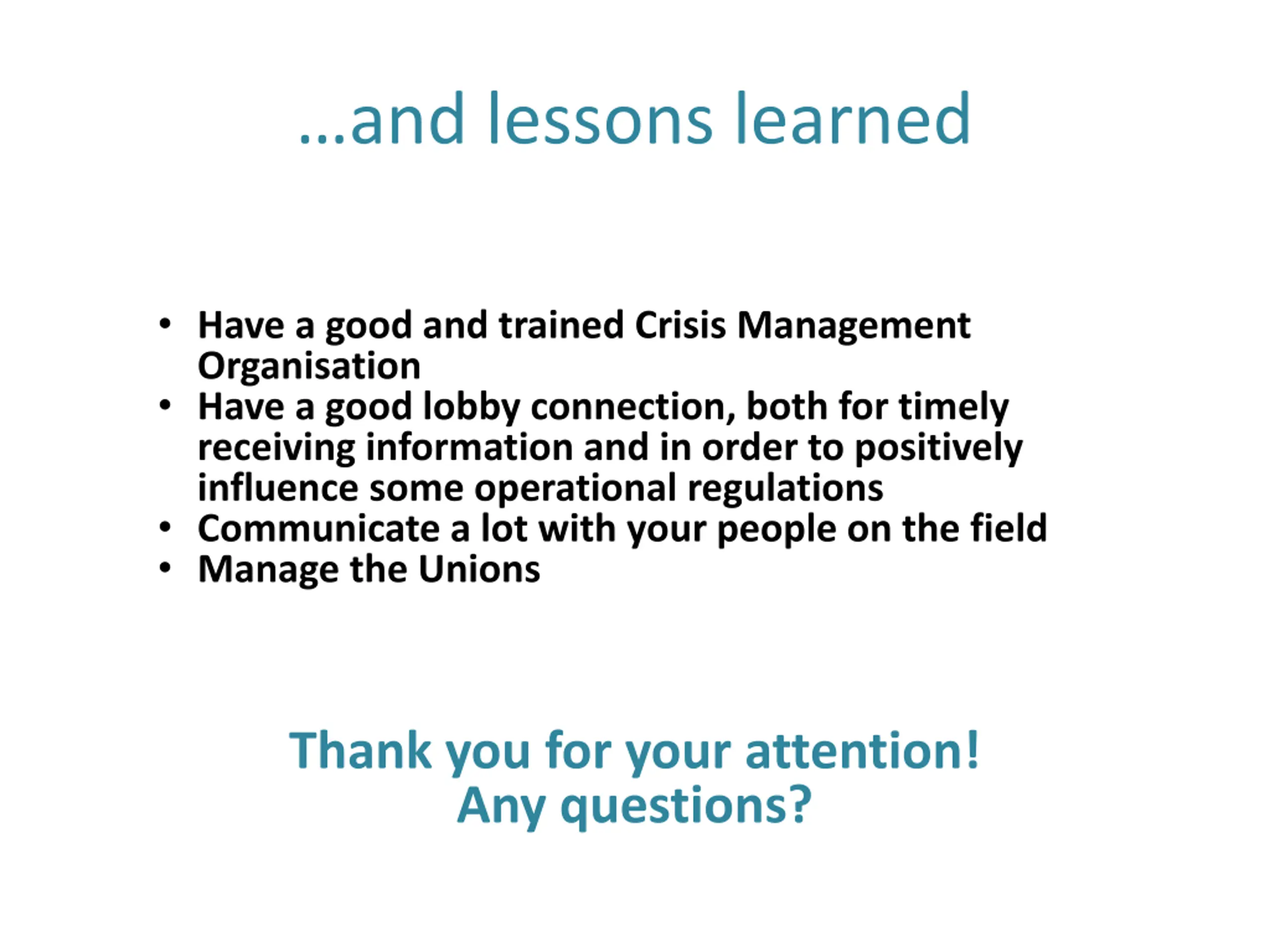 and lessons learned Have a good and trained Crisis Management Organisation Have a good lobby connection, both for timely receiving information and in order to positively influence some operational regulations Communicate a lot with your people on the field Manage the Unions Thank you for your attention! Any questions?