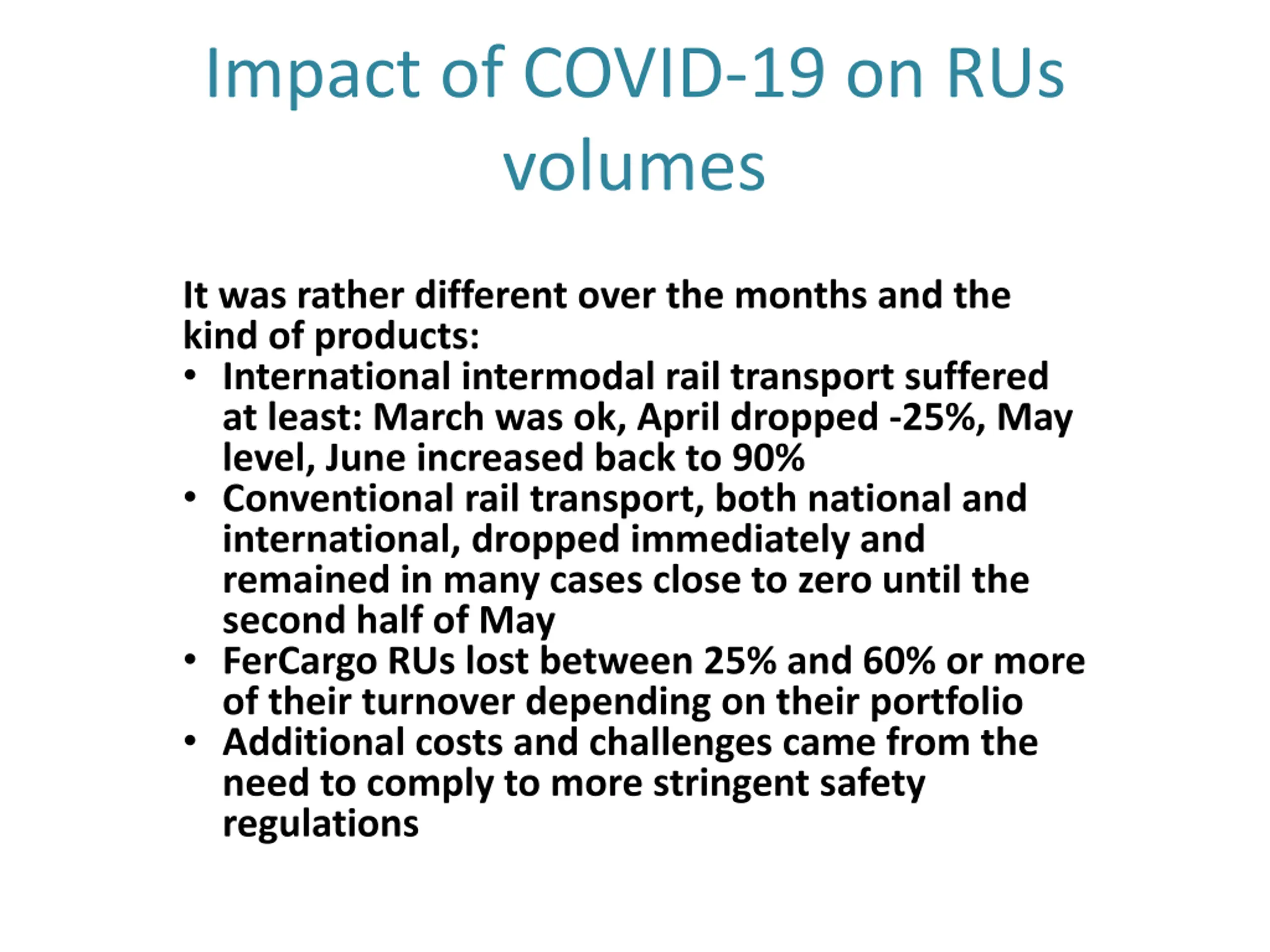 Impact of COVID-19 on RUs volumes It was rather different over the months and the kind of products: International intermodal rail transport suffered at least: March was ok, April dropped -25%, May level, June increased back to 90% Conventional rail transport, both national and international, dropped immediately and remained in many cases close to zero until the second half of May FerCargo RUs lost between 25% and 60% or more of their turnover depending on their portfolio Additional costs and challenges came from the need to comply to more stringent safety regulations