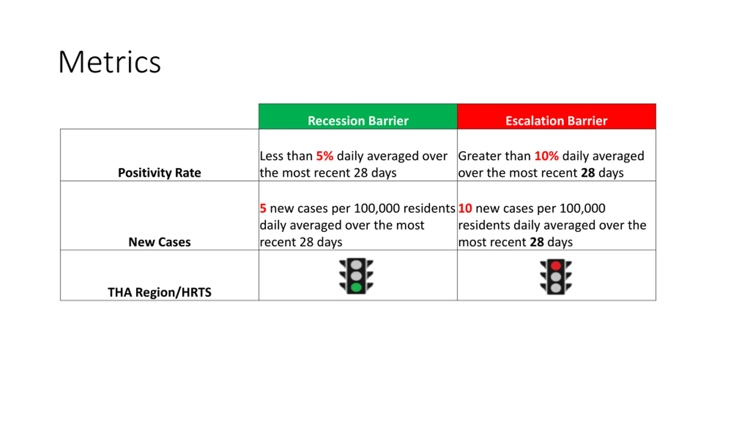 Metrics Recession Barrier Escalation Barrier Less than 5% daily averaged over the most recent 28 days Greater than 10% daily averaged over the most recent 28 days Positivity Rate 5 new cases per 100,000 residents daily averaged over the most recent 28 days 10 new cases per 100,000 residents daily averaged over the most recent 28 days New Cases THA Region/HRTS