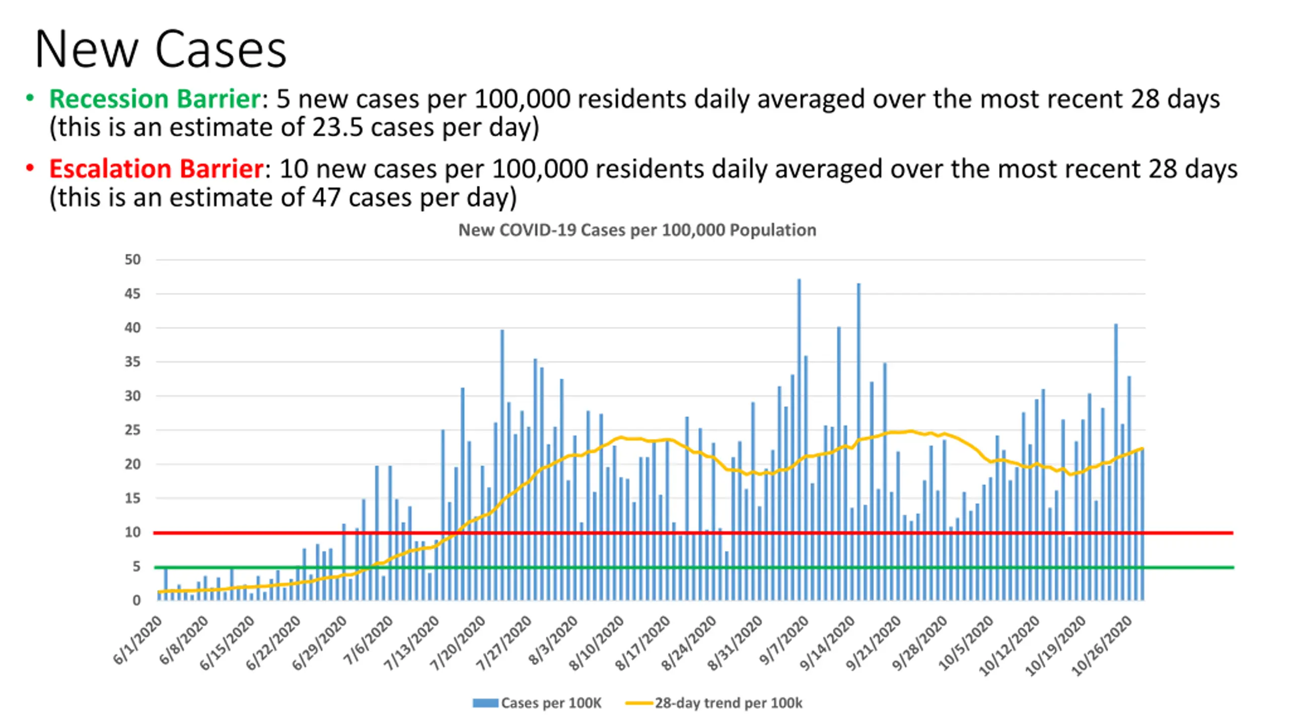 New Cases Recession Barrier: 5 new cases per 100,000 residents daily averaged over the most recent 28 days (this is an estimate of 23.5 cases per day) Escalation Barrier: 10 new cases per 100,000 residents daily averaged over the most recent 28 days (this is an estimate of 47 cases per day) New COVID-19 Cases per 100,000 Population 50 45 40 35 30 25 20 15 10 5 0 Cases per 100K 28-day trend per 100k