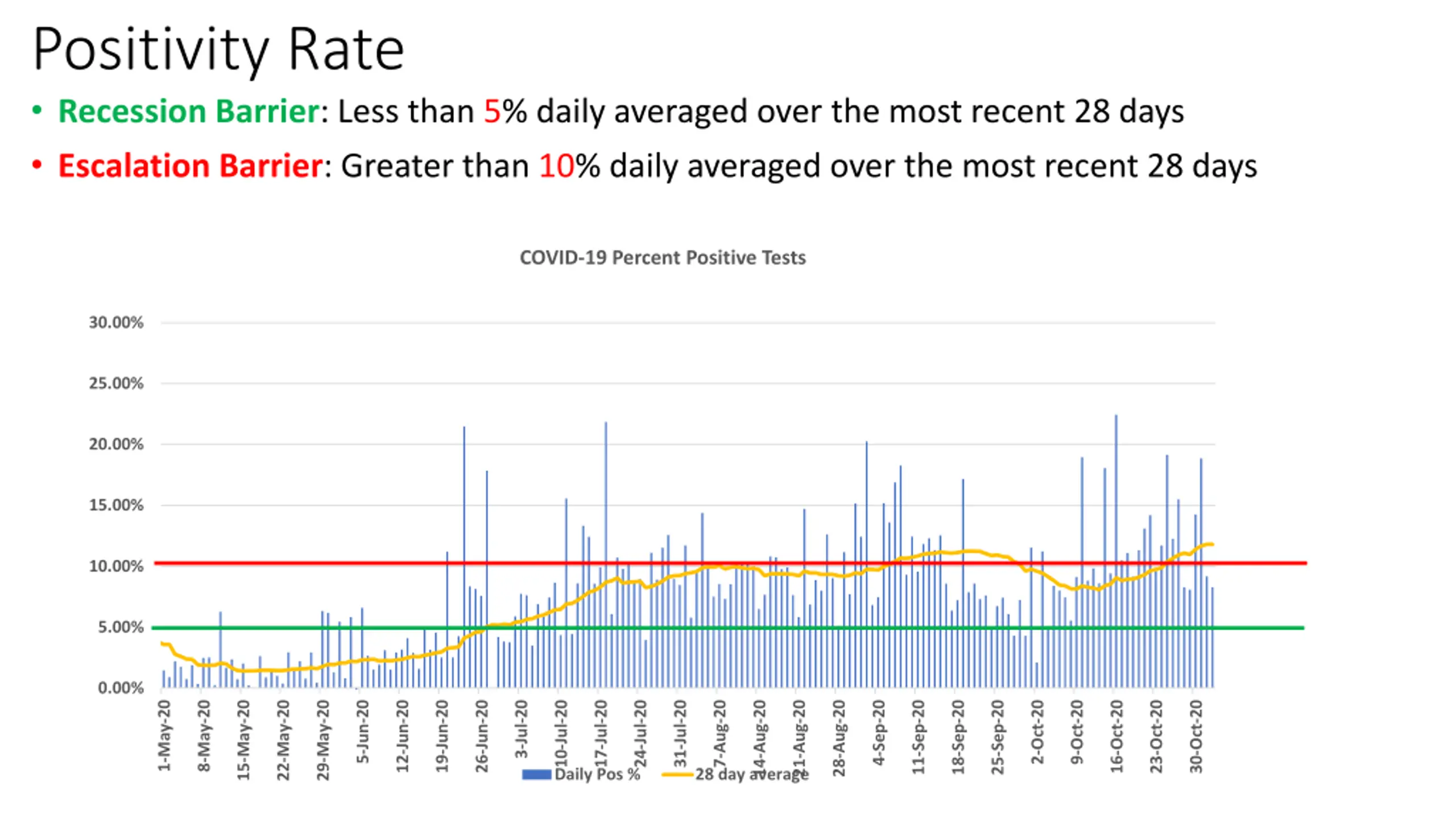 Positivity Rate Recession Barrier: Less than 5% daily averaged over the most recent 28 days Escalation Barrier: Greater than 10% daily averaged over the most recent 28 days COVID-19 Percent Positive Tests 30.00% 25.00% 20.00% 15.00% 10.00% 5.00% 0.00% 25-Sep-20 11-Sep-20 18-Sep-20 12-Jun-20 19-Jun-20 26-Jun-20 10-Jul-20 Daily Pos % 17-Jul-20 24-Jul-20 31-Jul-20 2-Oct-20 9-Oct-20 3-Jul-20 1-May-20 8-May-20 4-Sep-20 5-Jun-20 16-Oct-20 7-Aug-20 14-Aug-20 21-Aug-20 28-Aug-20 15-May-20 22-May-20 29-May-20 23-Oct-20 30-Oct-20 28 day average