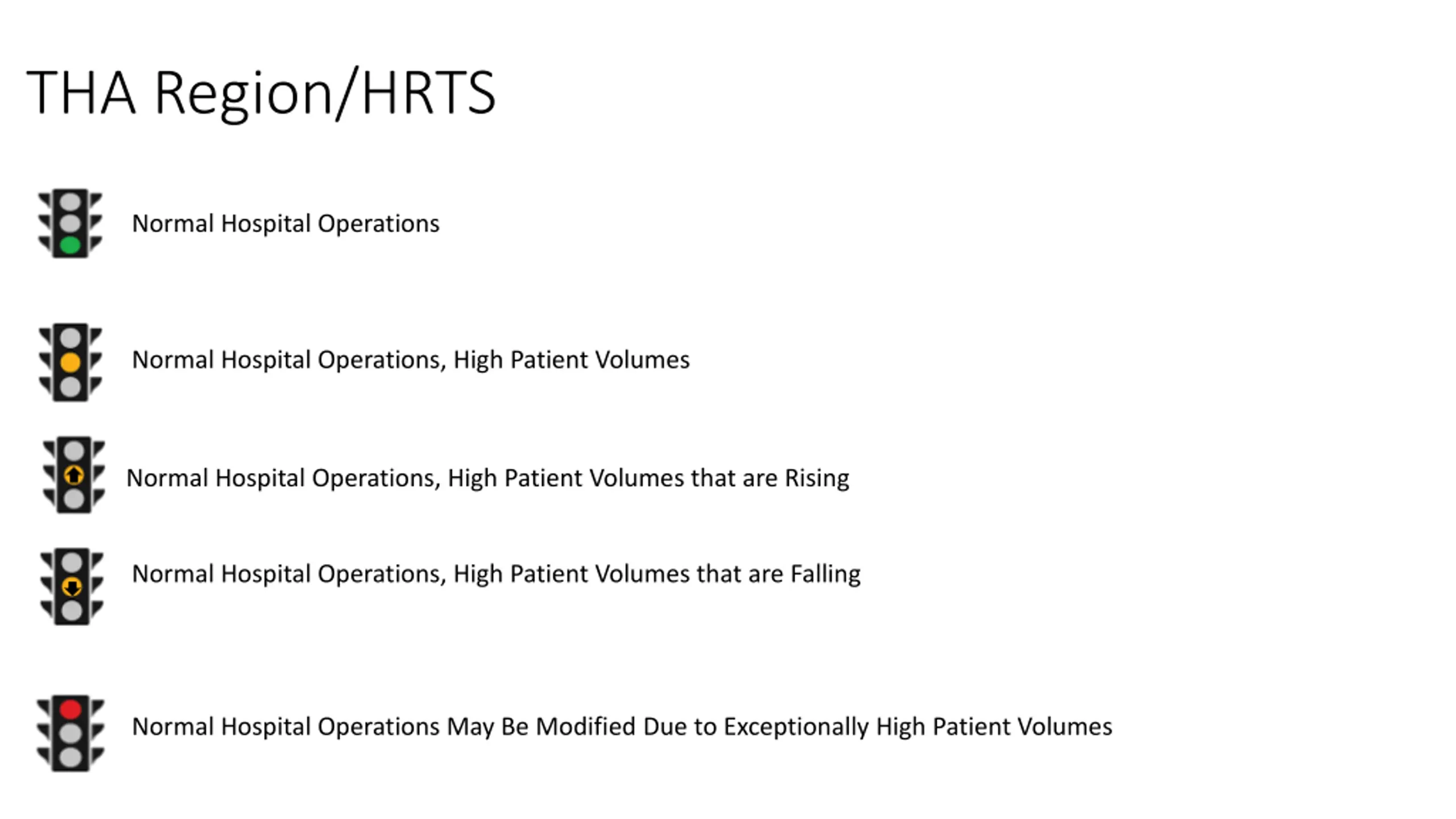 THA Region/HRTS Normal Hospital Operations Normal Hospital Operations, High Patient Volumes Normal Hospital Operations, High Patient Volumes that are Rising Normal Hospital Operations, High Patient Volumes that are Falling Normal Hospital Operations May Be Modified Due to Exceptionally High Patient Volumes