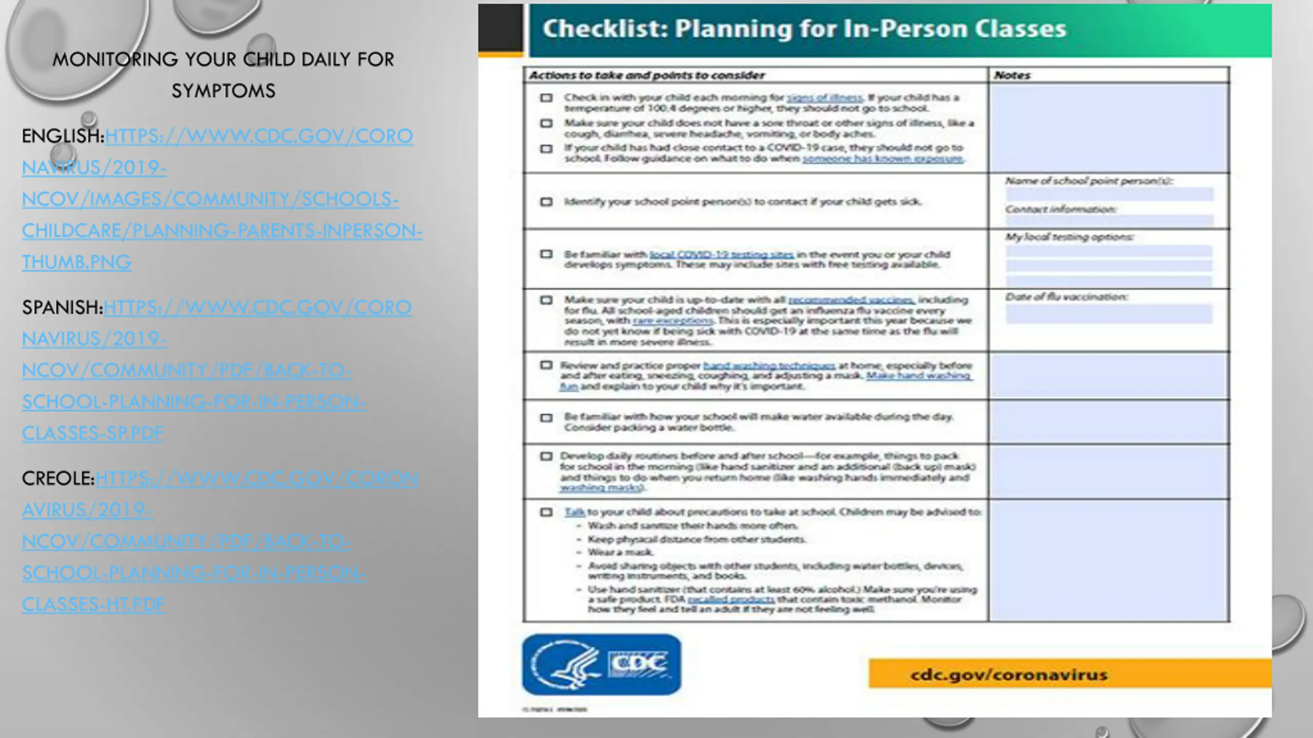 MONITORING YOUR CHILD DAILY FOR SYMPTOMS ENGLISH:HTTPS://WWW.CDC.GOV/CORO NAVIRUS/2019- NCOV/IMAGES/COMMUNITY/SCHOOLS- CHILDCARE/PLANNING-PARENTS-INPERSON- THUMB.PNG SPANISH:HTTPS://WWW.CDC.GOV/CORO NAVIRUS/2019- NCOV/COMMUNITY/PDF/BACK-TO- SCHOOL-PLANNING-FOR-IN-PERSON- CLASSES-SP.PDF CREOLE:HTTPS://WWW.CDC.GOV/CORON AVIRUS/2019- NCOV/COMMUNITY/PDF/BACK-TO- SCHOOL-PLANNING-FOR-IN-PERSON- CLASSES-HT.PDF