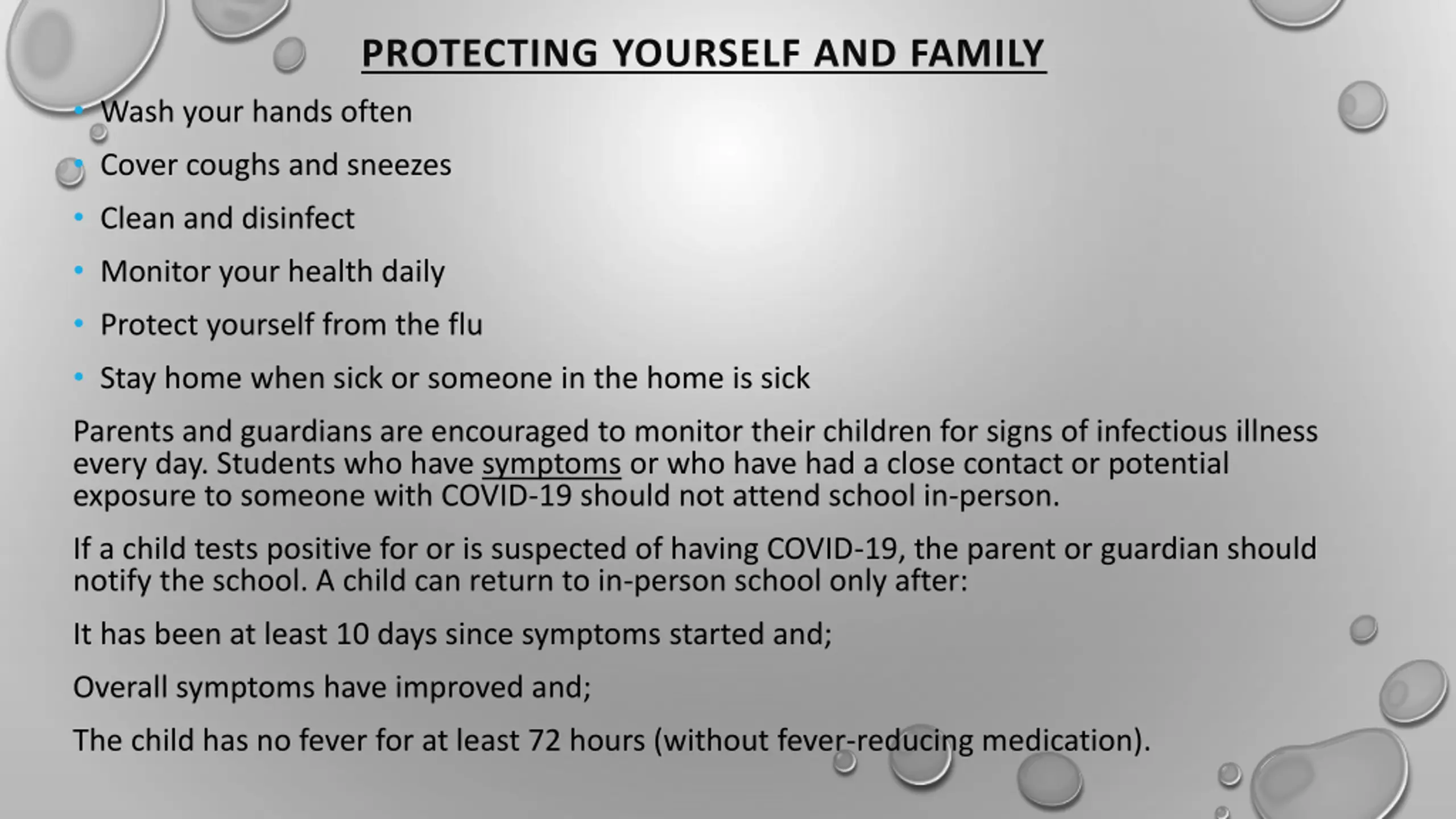 PROTECTING YOURSELF AND FAMILY Wash your hands often Cover coughs and sneezes Clean and disinfect Monitor your health daily Protect yourself from the flu Stay home when sick or someone in the home is sick Parents and guardians are encouraged to monitor their children for signs of infectious illness every day. Students who have symptoms or who have had a close contact or potential exposure to someone with COVID-19 should not attend school in-person. If a child tests positive for or is suspected of having COVID-19, the parent or guardian should notify the school. A child can return to in-person school only after: It has been at least 10 days since symptoms started and; Overall symptoms have improved and; The child has no fever for at least 72 hours (without fever-reducing medication).
