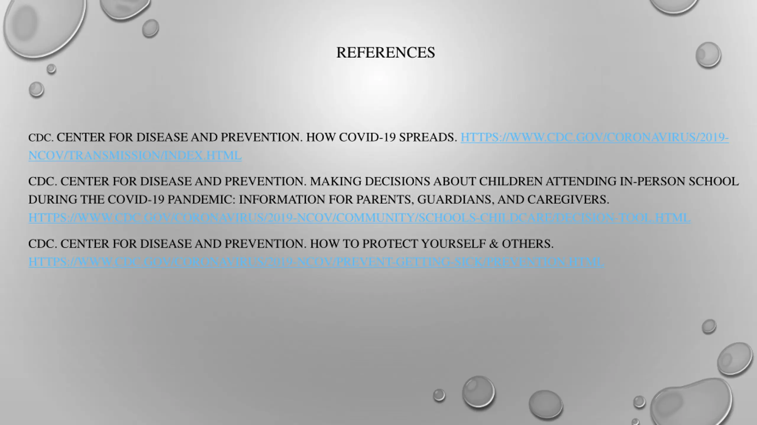 REFERENCES CDC. CENTER FOR DISEASE AND PREVENTION. HOW COVID-19 SPREADS. HTTPS://WWW.CDC.GOV/CORONAVIRUS/2019- NCOV/TRANSMISSION/INDEX.HTML CDC. CENTER FOR DISEASE AND PREVENTION. MAKING DECISIONS ABOUT CHILDREN ATTENDING IN-PERSON SCHOOL DURING THE COVID-19 PANDEMIC: INFORMATION FOR PARENTS, GUARDIANS, AND CAREGIVERS. HTTPS://WWW.CDC.GOV/CORONAVIRUS/2019-NCOV/COMMUNITY/SCHOOLS-CHILDCARE/DECISION-TOOL.HTML CDC. CENTER FOR DISEASE AND PREVENTION. HOW TO PROTECT YOURSELF & OTHERS. HTTPS://WWW.CDC.GOV/CORONAVIRUS/2019-NCOV/PREVENT-GETTING-SICK/PREVENTION.HTML