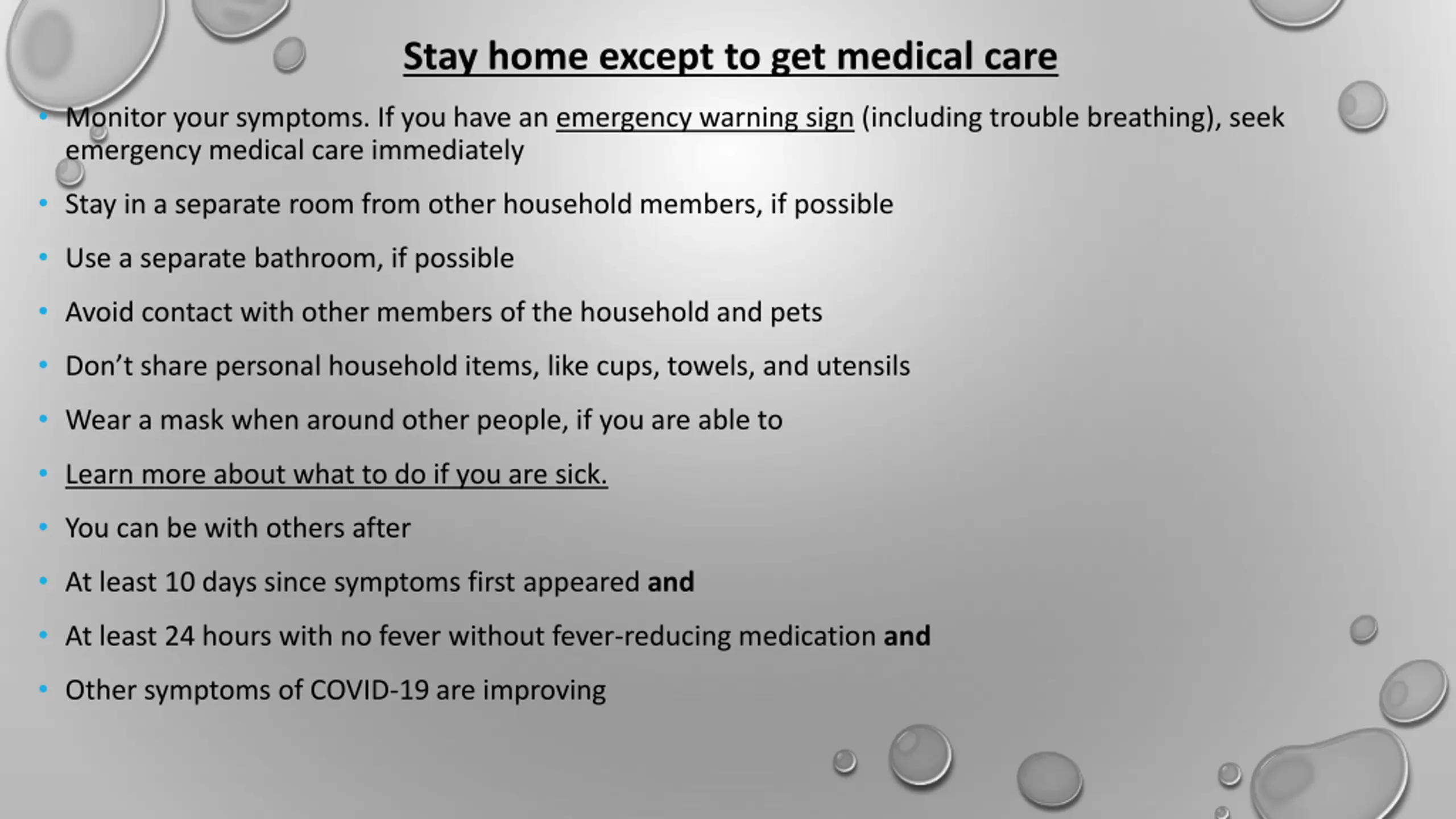 Stay home except to get medical care Monitor your symptoms. If you have an emergency warning sign (including trouble breathing), seek emergency medical care immediately Stay in a separate room from other household members, if possible Use a separate bathroom, if possible Avoid contact with other members of the household and pets Don t share personal household items, like cups, towels, and utensils Wear a mask when around other people, if you are able to Learn more about what to do if you are sick. You can be with others after At least 10 days since symptoms first appeared and At least 24 hours with no fever without fever-reducing medication and Other symptoms of COVID-19 are improving