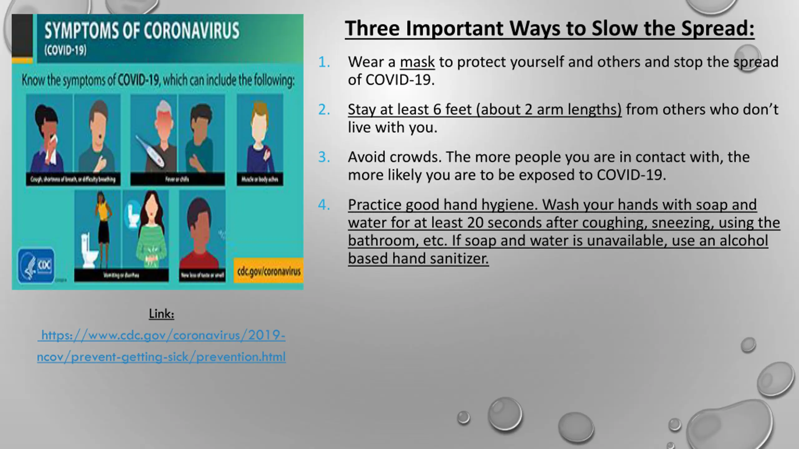 Three Important Ways to Slow the Spread: 1. Wear a mask to protect yourself and others and stop the spread of COVID-19. 2. Stay at least 6 feet (about 2 arm lengths) from others who don t live with you. 3. Avoid crowds. The more people you are in contact with, the more likely you are to be exposed to COVID-19. 4. Practice good hand hygiene. Wash your hands with soap and water for at least 20 seconds after coughing, sneezing, using the bathroom, etc. If soap and water is unavailable, use an alcohol based hand sanitizer. Link: https://www.cdc.gov/coronavirus/2019- ncov/prevent-getting-sick/prevention.html