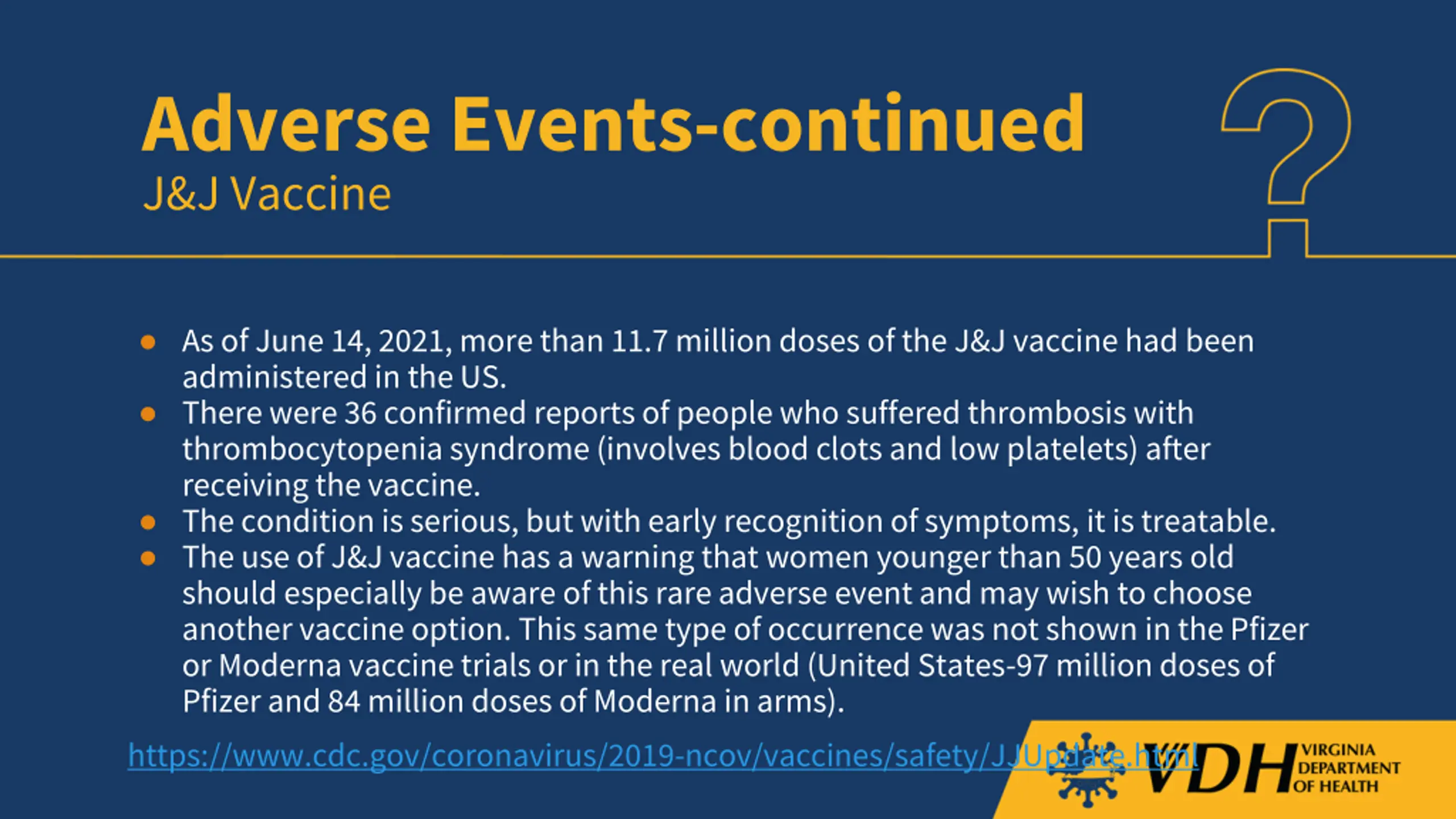 Adverse Events-continued J&J Vaccine As of June 14, 2021, more than 11.7 million doses of the J&J vaccine had been administered in the US. There were 36 confirmed reports of people who suffered thrombosis with thrombocytopenia syndrome (involves blood clots and low platelets) after receiving the vaccine. The condition is serious, but with early recognition of symptoms, it is treatable. The use of J&J vaccine has a warning that women younger than 50 years old should especially be aware of this rare adverse event and may wish to choose another vaccine option. This same type of occurrence was not shown in the Pfizer or Moderna vaccine trials or in the real world (United States-97 million doses of Pfizer and 84 million doses of Moderna in arms). https://www.cdc.gov/coronavirus/2019-ncov/vaccines/safety/JJUpdate.html