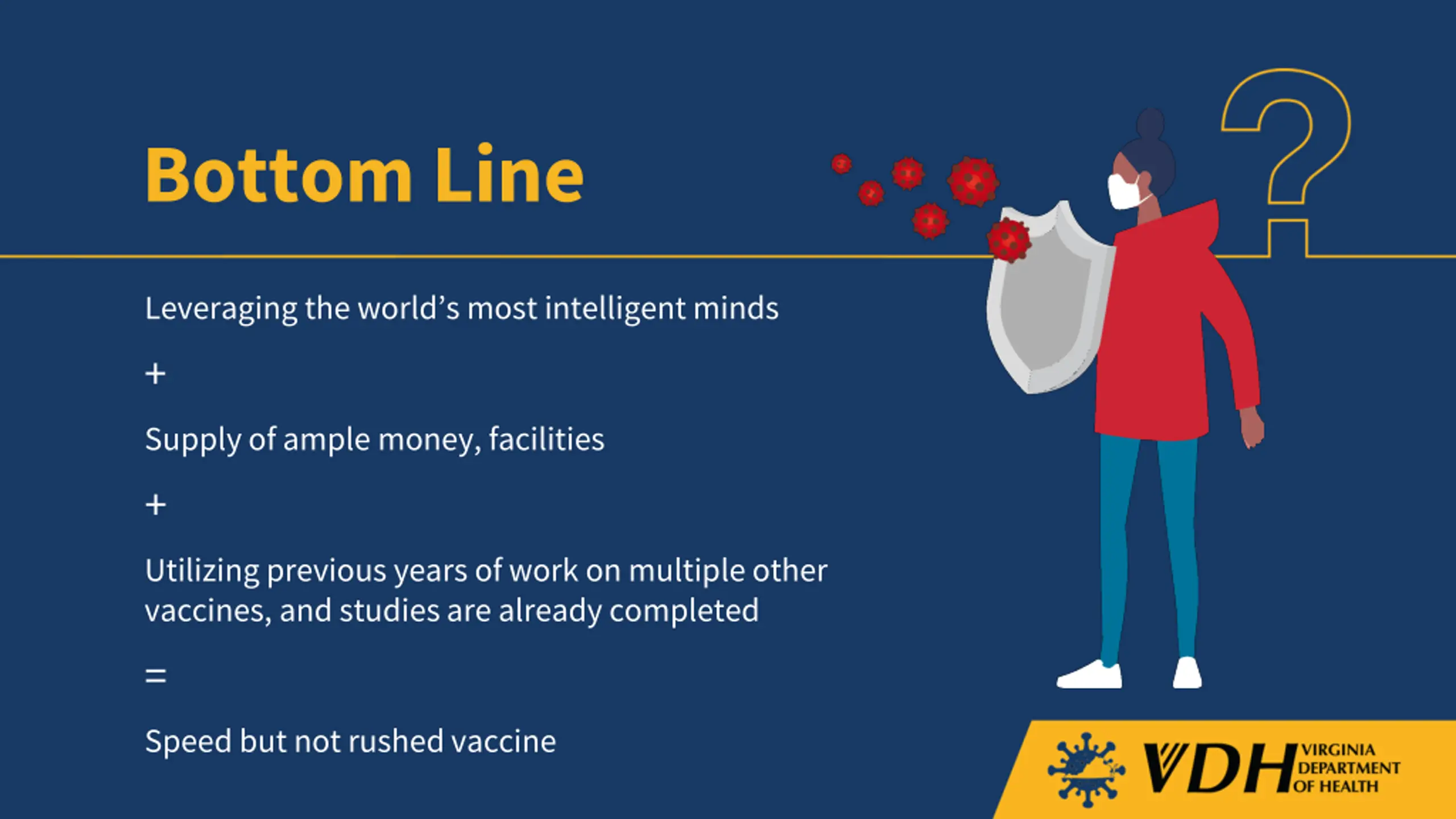 Bottom Line Leveraging the world s most intelligent minds + Supply of ample money, facilities + Utilizing previous years of work on multiple other vaccines, and studies are already completed = Speed but not rushed vaccine