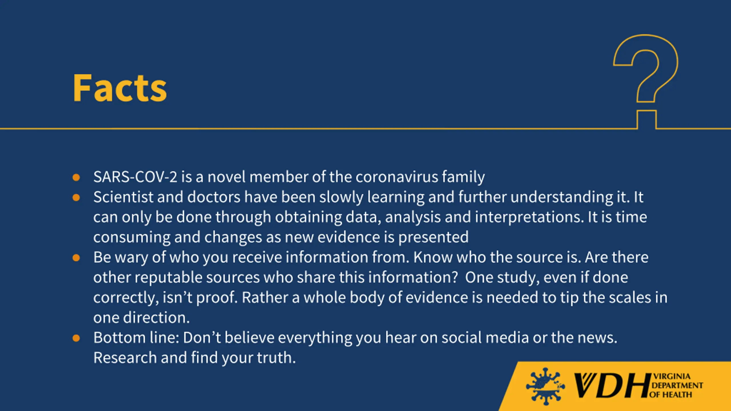 Facts SARS-COV-2 is a novel member of the coronavirus family Scientist and doctors have been slowly learning and further understanding it. It can only be done through obtaining data, analysis and interpretations. It is time consuming and changes as new evidence is presented Be wary of who you receive information from. Know who the source is. Are there other reputable sources who share this information? One study, even if done correctly, isn t proof. Rather a whole body of evidence is needed to tip the scales in one direction. Bottom line: Don t believe everything you hear on social media or the news. Research and find your truth.