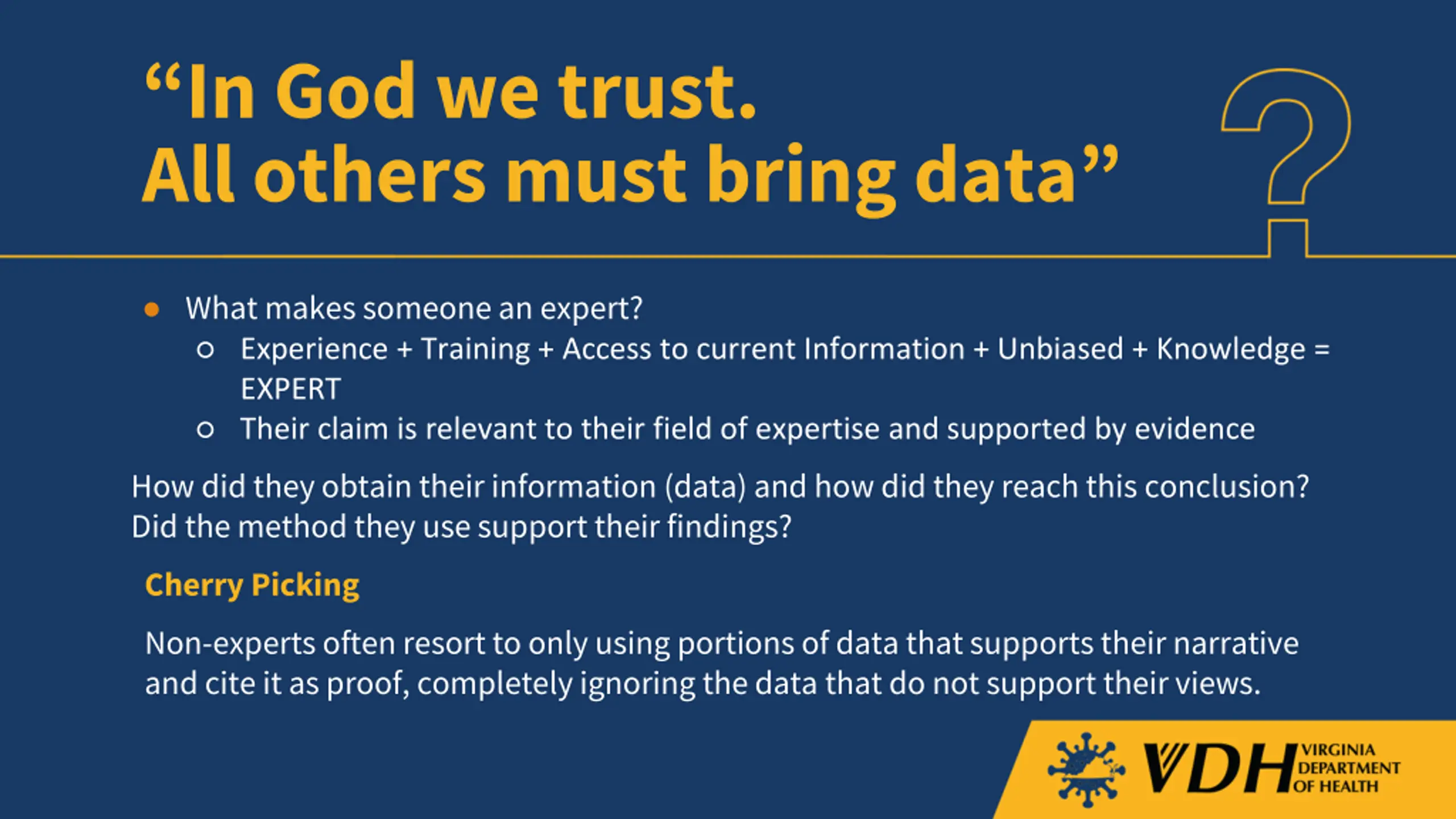 In God we trust. All others must bring data What makes someone an expert? Experience + Training + Access to current Information + Unbiased + Knowledge = EXPERT Their claim is relevant to their field of expertise and supported by evidence How did they obtain their information (data) and how did they reach this conclusion? Did the method they use support their findings? Cherry Picking Non-experts often resort to only using portions of data that supports their narrative and cite it as proof, completely ignoring the data that do not support their views.