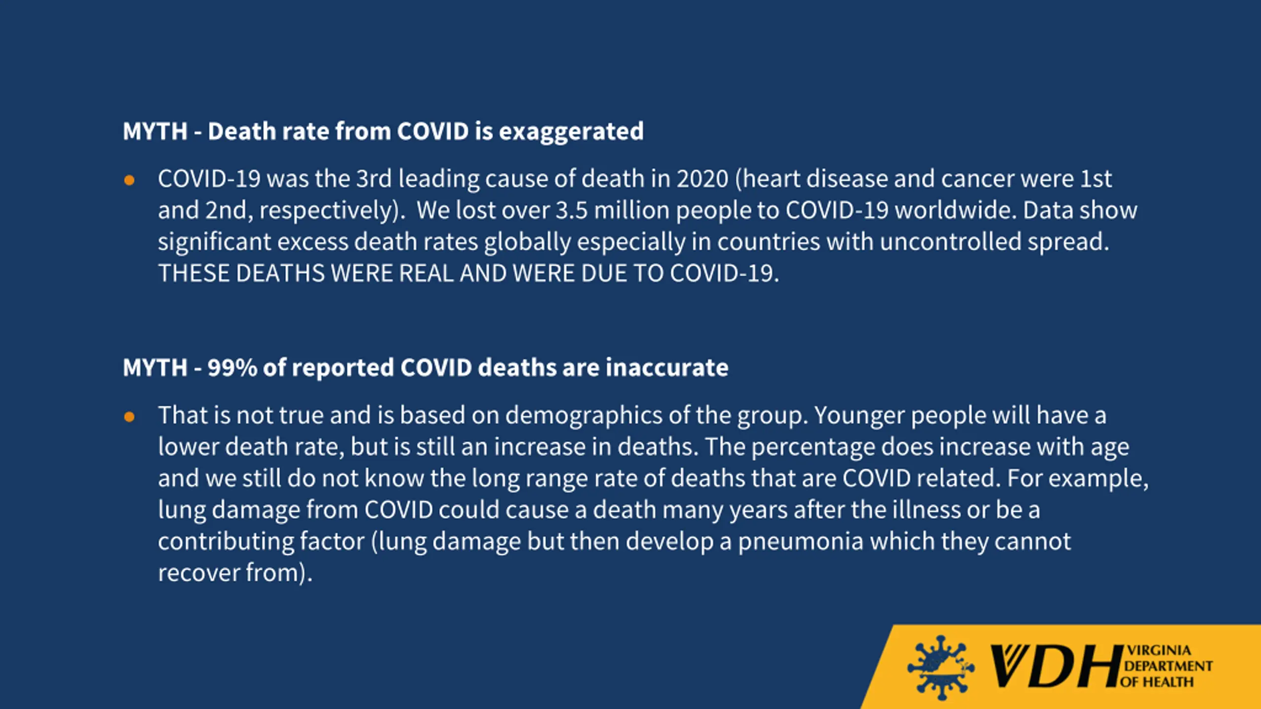 MYTH - Death rate from COVID is exaggerated COVID-19 was the 3rd leading cause of death in 2020 (heart disease and cancer were 1st and 2nd, respectively). We lost over 3.5 million people to COVID-19 worldwide. Data show significant excess death rates globally especially in countries with uncontrolled spread. THESE DEATHS WERE REAL AND WERE DUE TO COVID-19. MYTH - 99% of reported COVID deaths are inaccurate That is not true and is based on demographics of the group. Younger people will have a lower death rate, but is still an increase in deaths. The percentage does increase with age and we still do not know the long range rate of deaths that are COVID related. For example, lung damage from COVID could cause a death many years after the illness or be a contributing factor (lung damage but then develop a pneumonia which they cannot recover from).