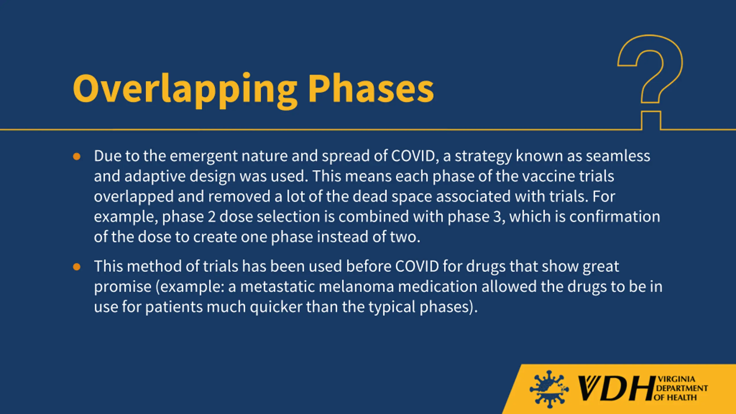 Overlapping Phases Due to the emergent nature and spread of COVID, a strategy known as seamless and adaptive design was used. This means each phase of the vaccine trials overlapped and removed a lot of the dead space associated with trials. For example, phase 2 dose selectionis combined with phase 3, which is confirmation of the dose to create one phase instead of two. This method of trials has been used before COVID for drugs that show great promise (example: a metastatic melanoma medication allowed the drugs to be in use for patients much quicker than the typical phases).