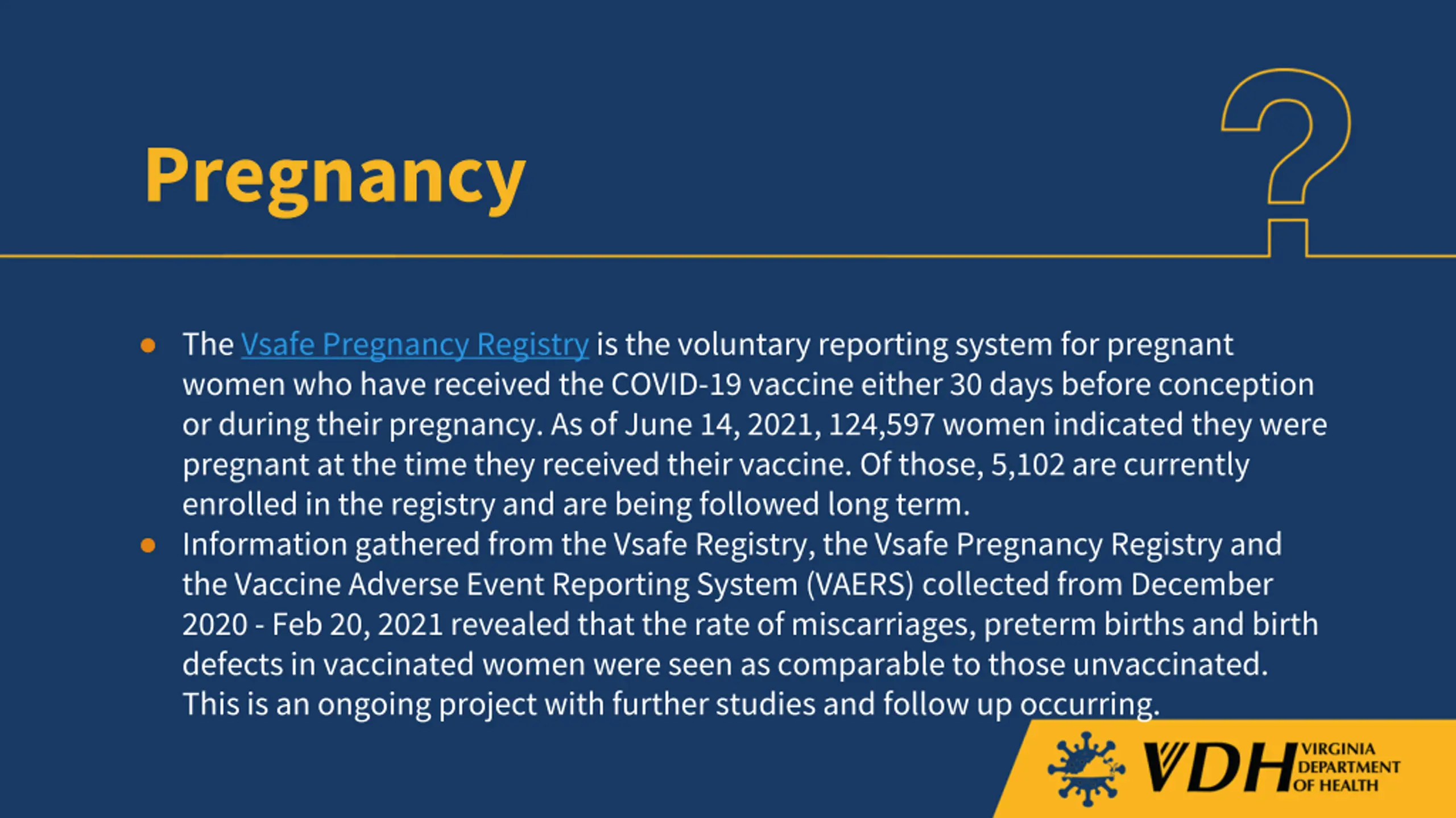 Pregnancy The Vsafe Pregnancy Registry is the voluntary reporting system for pregnant women who have received the COVID-19 vaccine either 30 days before conception or during their pregnancy. As of June 14, 2021, 124,597 women indicated they were pregnant at the time they received their vaccine. Of those, 5,102 are currently enrolled in the registry and are being followed long term. Information gathered from the Vsafe Registry, the Vsafe Pregnancy Registry and the Vaccine Adverse Event Reporting System (VAERS) collected from December 2020 - Feb 20, 2021 revealed that the rate of miscarriages, preterm births and birth defects in vaccinated women were seen as comparable to those unvaccinated. This is an ongoing project with further studies and follow up occurring.