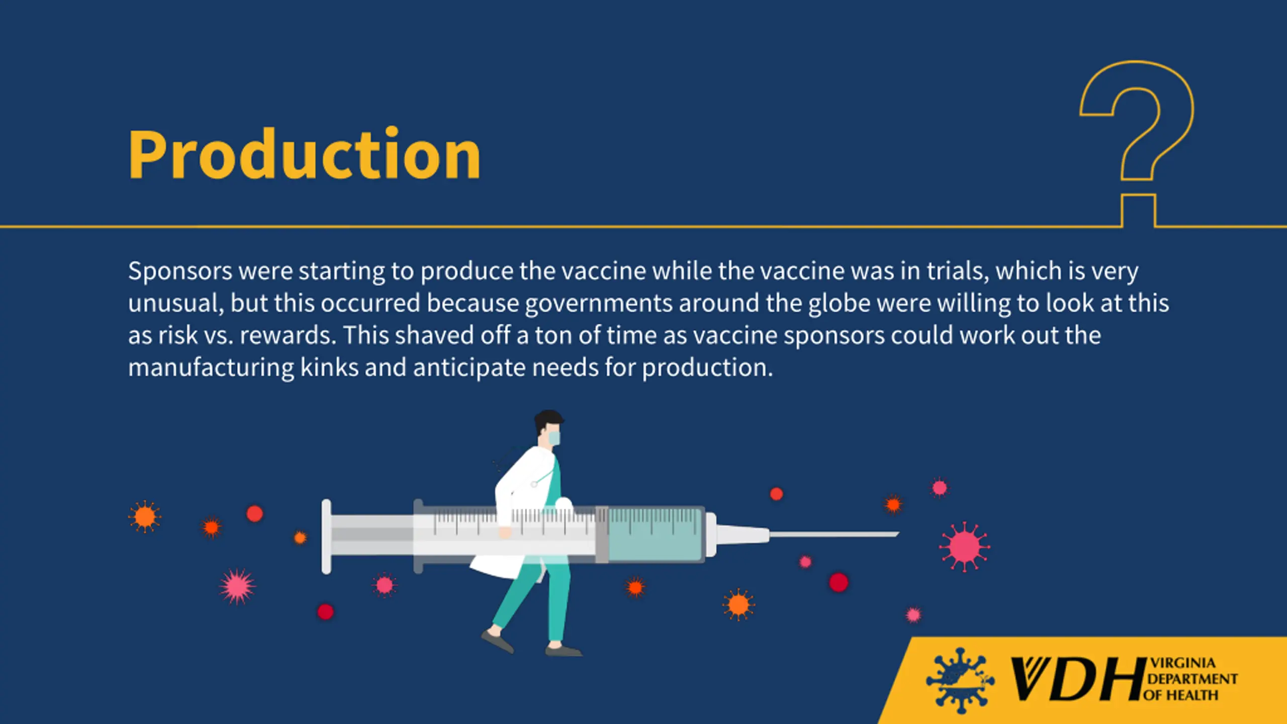 Production Sponsors were starting to produce the vaccine while the vaccine was in trials, which is very unusual, but this occurred because governments around the globe were willing to look at this as risk vs. rewards. This shaved off a ton of time as vaccine sponsors could work out the manufacturing kinks and anticipate needs for production.