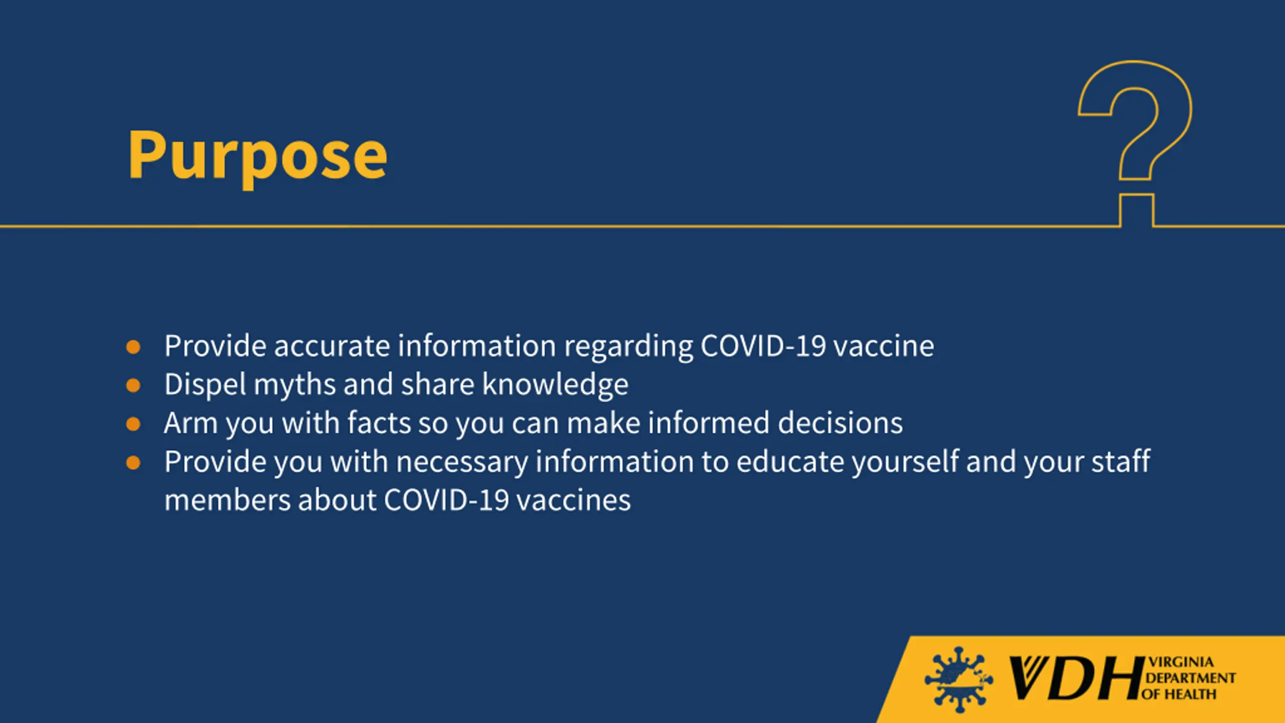 Purpose Provide accurate information regarding COVID-19 vaccine Dispel myths and share knowledge Arm you with facts so you can make informed decisions Provide you with necessary information to educate yourself and your staff members about COVID-19 vaccines