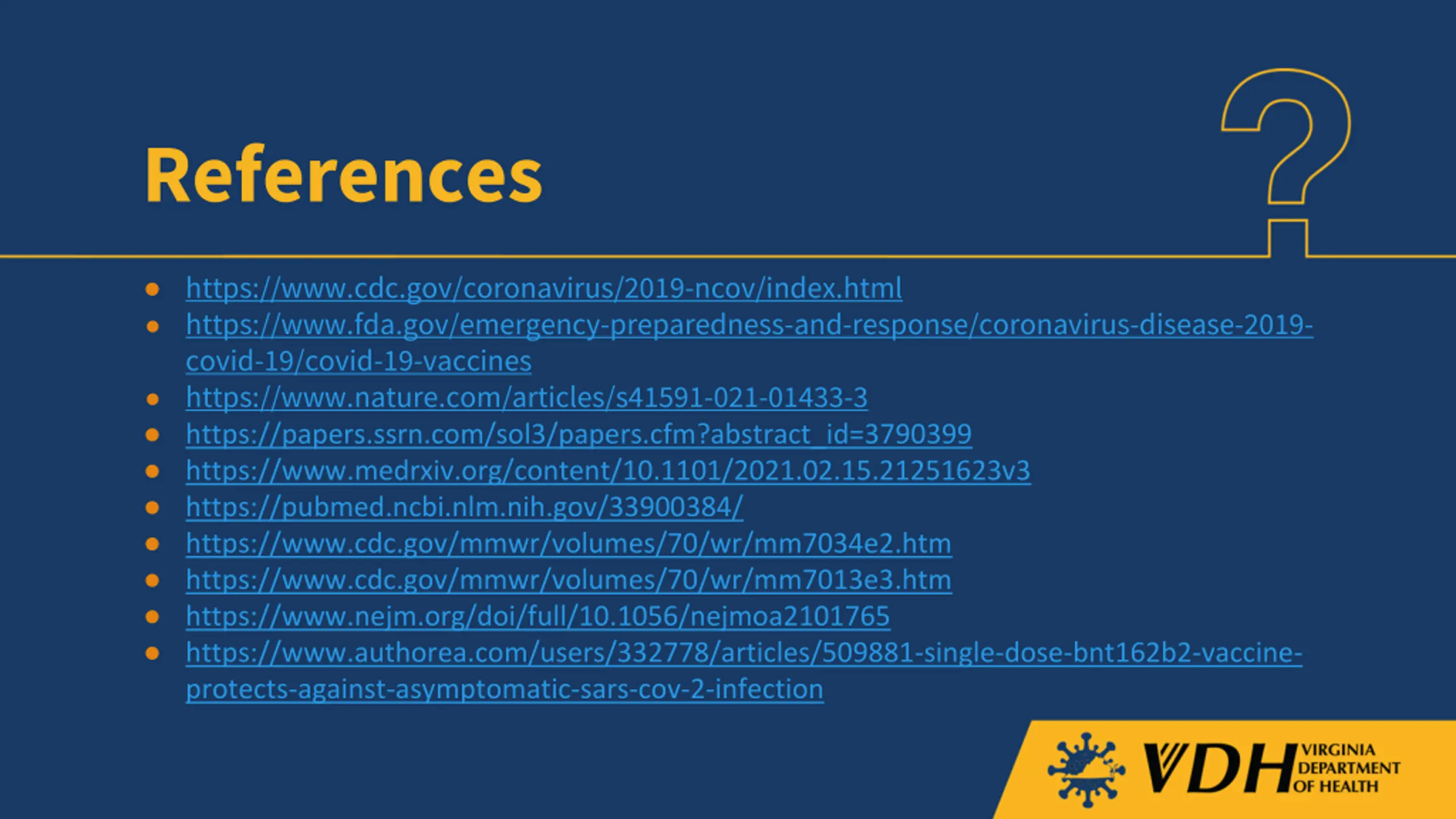 References https://www.cdc.gov/coronavirus/2019-ncov/index.html https://www.fda.gov/emergency-preparedness-and-response/coronavirus-disease-2019- covid-19/covid-19-vaccines https://www.nature.com/articles/s41591-021-01433-3 https://papers.ssrn.com/sol3/papers.cfm?abstract_id=3790399 https://www.medrxiv.org/content/10.1101/2021.02.15.21251623v3 https://pubmed.ncbi.nlm.nih.gov/33900384/ https://www.cdc.gov/mmwr/volumes/70/wr/mm7034e2.htm https://www.cdc.gov/mmwr/volumes/70/wr/mm7013e3.htm https://www.nejm.org/doi/full/10.1056/nejmoa2101765 https://www.authorea.com/users/332778/articles/509881-single-dose-bnt162b2-vaccine- protects-against-asymptomatic-sars-cov-2-infection