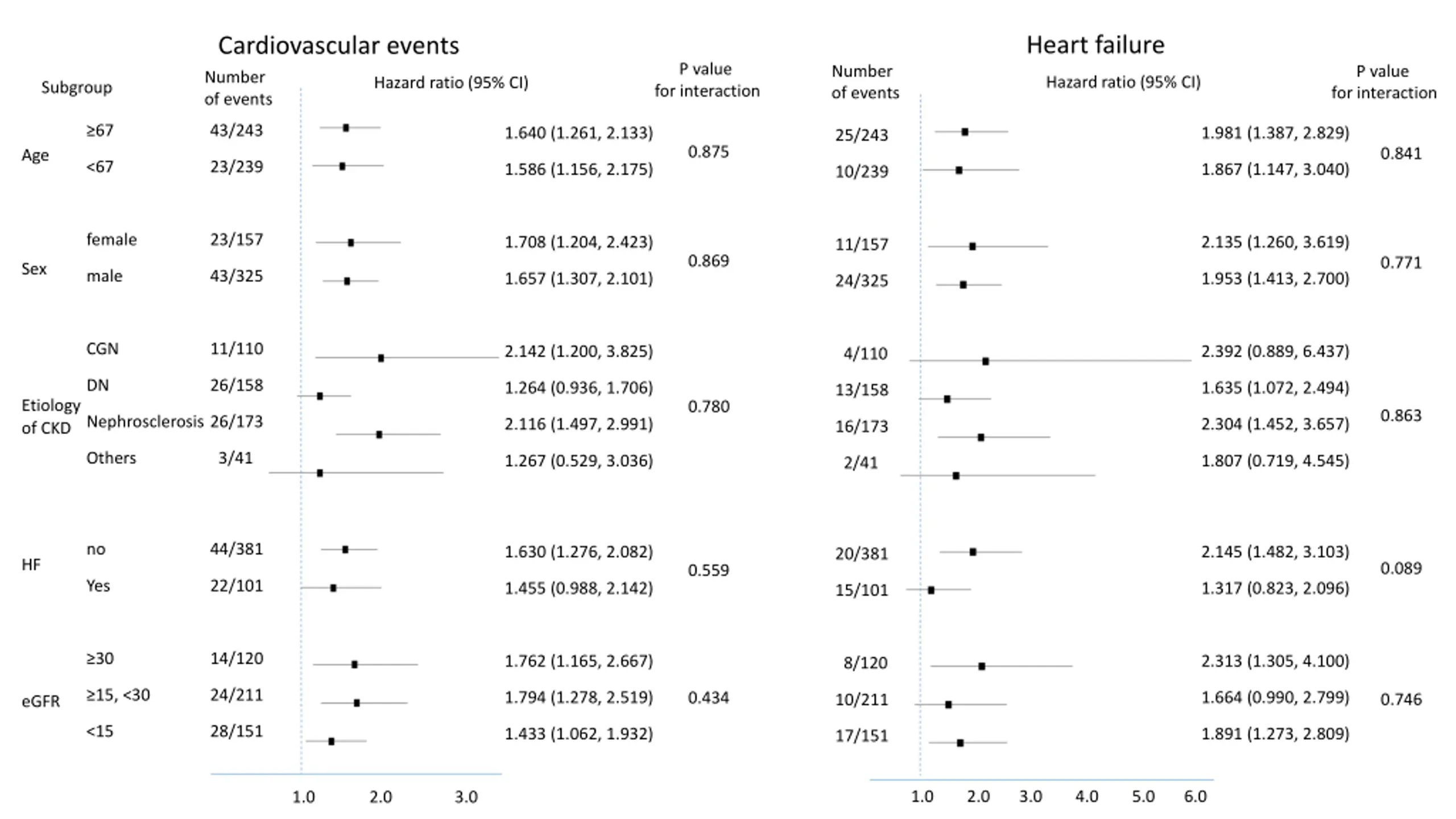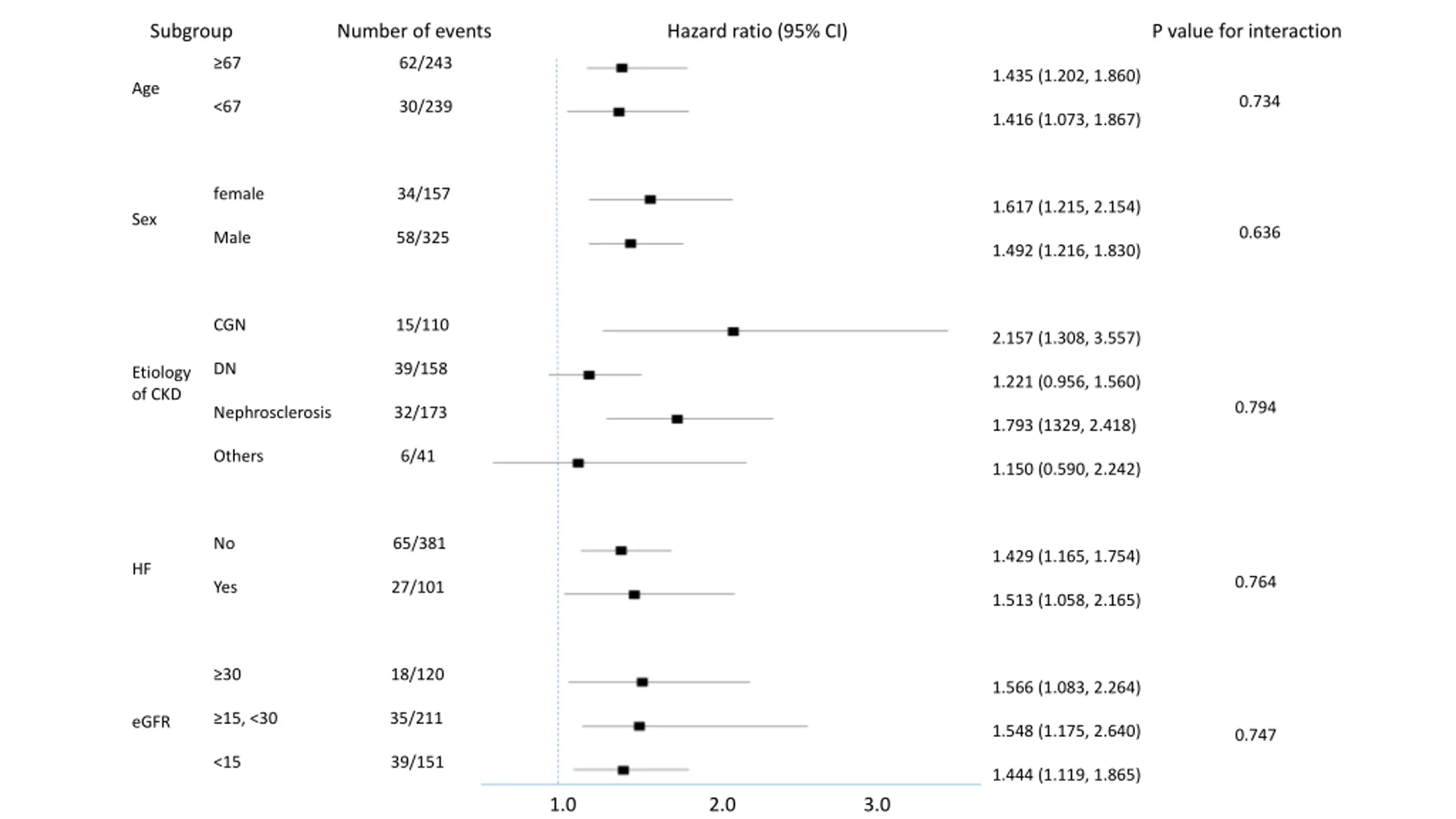 Subgroup Number of events Hazard ratio (95% CI) P value for interaction 67 62/243 1.435 (1.202, 1.860) Age 0.734 <67 30/239 1.416 (1.073, 1.867) female 34/157 1.617 (1.215, 2.154) Sex 0.636 Male 58/325 1.492 (1.216, 1.830) CGN 15/110 2.157 (1.308, 3.557) DN 39/158 Etiology of CKD 1.221 (0.956, 1.560) 0.794 Nephrosclerosis 32/173 1.793 (1329, 2.418) Others 6/41 1.150 (0.590, 2.242) No 65/381 1.429 (1.165, 1.754) HF 0.764 Yes 27/101 1.513 (1.058, 2.165) 30 18/120 1.566 (1.083, 2.264) 15, <30 35/211 eGFR 1.548 (1.175, 2.640) 0.747 <15 39/151 1.444 (1.119, 1.865) 1.0 2.0 3.0