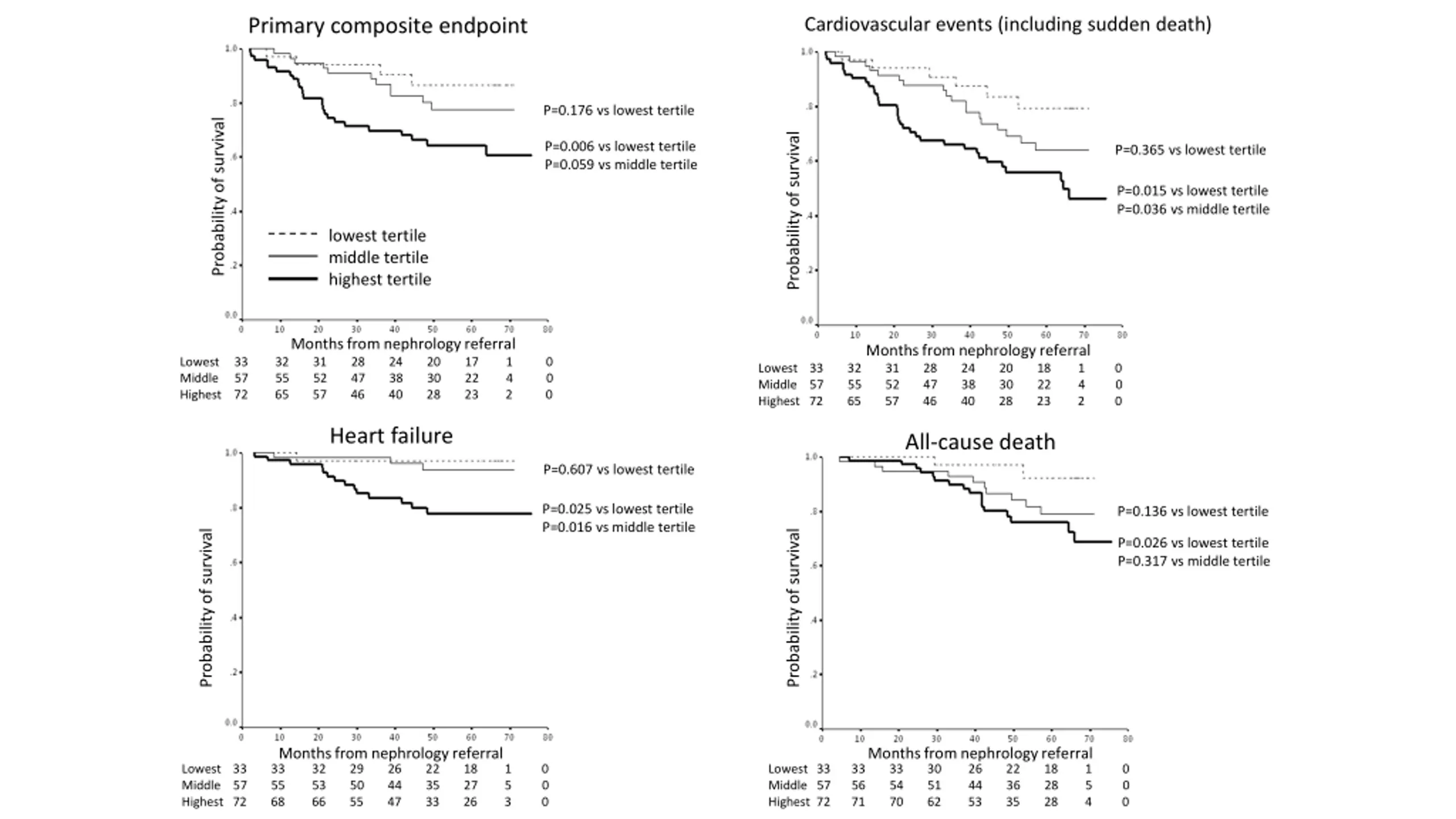 Primary composite endpoint Cardiovascular events (including sudden death) P=0.176 vs lowest tertile Probability of survival Probability of survival P=0.006 vs lowest tertile P=0.059 vs middle tertile P=0.365 vs lowest tertile P=0.015 vs lowest tertile P=0.036 vs middle tertile lowest tertile middle tertile highest tertile Months from nephrology referral Lowest 33 32 31 28 24 20 17 1 0 Middle 57 55 52 47 38 30 22 4 0 Highest 72 65 57 46 40 28 23 2 0 Months from nephrology referral Lowest 33 32 31 28 24 20 18 1 0 Middle 57 55 52 47 38 30 22 4 0 Highest 72 65 57 46 40 28 23 2 0 Heart failure All-cause death P=0.607 vs lowest tertile P=0.025 vs lowest tertile P=0.016 vs middle tertile P=0.136 vs lowest tertile Probability of survival Probability of survival P=0.026 vs lowest tertile P=0.317 vs middle tertile Months from nephrology referral Lowest 33 33 32 29 26 22 18 1 0 Middle 57 55 53 50 44 35 27 5 0 Highest 72 68 66 55 47 33 26 3 0 Months from nephrology referral Lowest 33 33 33 30 26 22 18 1 0 Middle 57 56 54 51 44 36 28 5 0 Highest 72 71 70 62 53 35 28 4 0
