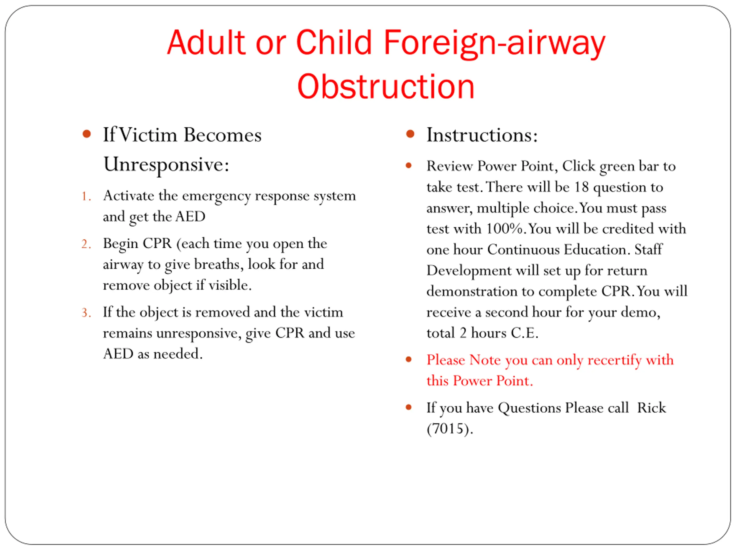 Adult or Child Foreign-airway Obstruction If Victim Becomes Unresponsive: 1. Activate the emergency response system and get the AED 2. Begin CPR (each time you open the airway to give breaths, look for and remove object if visible. 3. If the object is removed and the victim remains unresponsive, give CPR and use AED as needed. Instructions: Review Power Point, Click green bar to take test. There will be 18 question to answer, multiple choice. You must pass test with 100%. You will be credited with one hour Continuous Education. Staff Development will set up for return demonstration to complete CPR. You will receive a second hour for your demo, total 2 hours C.E. Please Note you can only recertify with this Power Point. If you have Questions Please call Rick (7015).