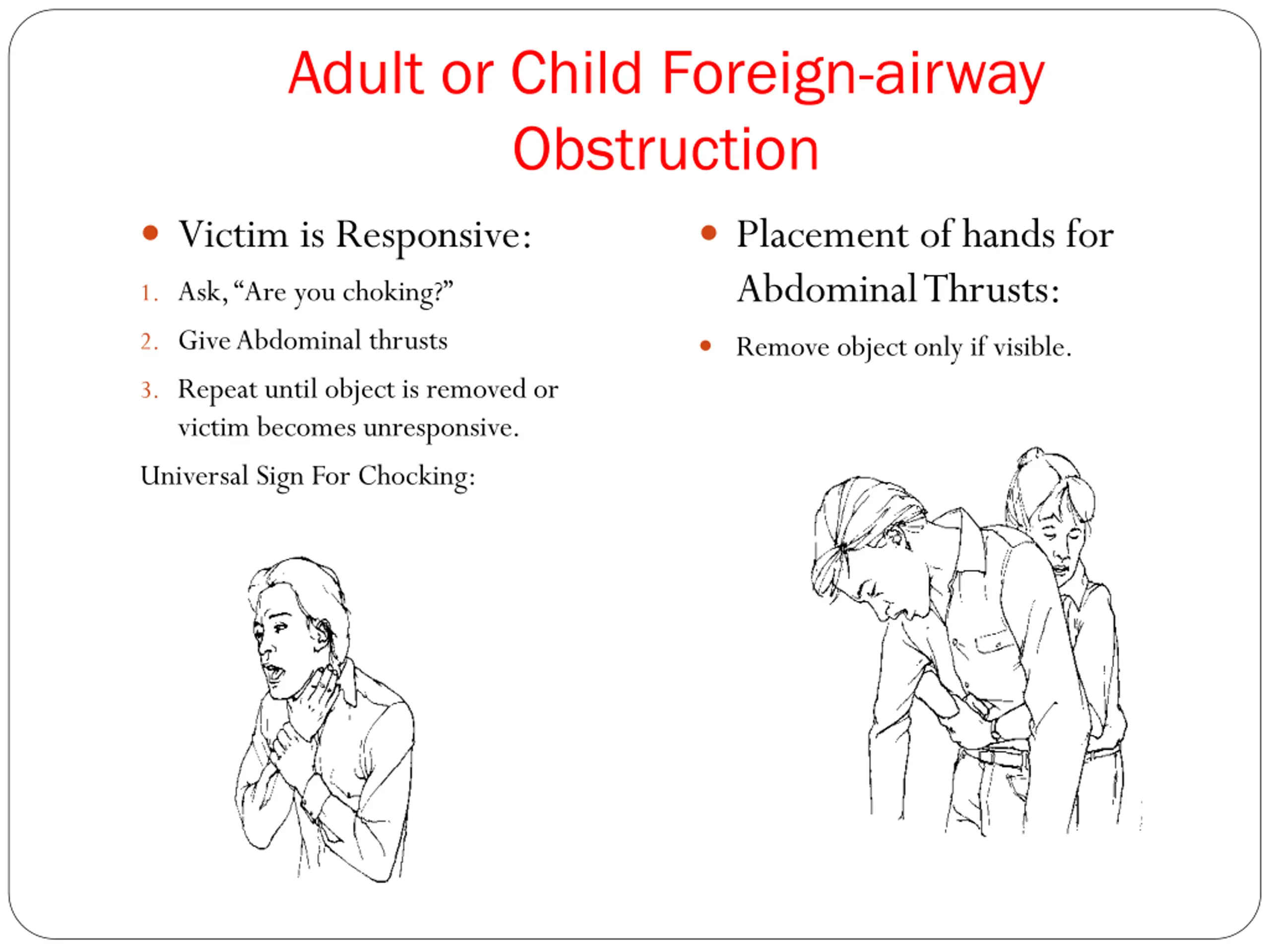 Adult or Child Foreign-airway Obstruction Victim is Responsive: 1. Ask, Are you choking? 2. Give Abdominal thrusts 3. Repeat until object is removed or victim becomes unresponsive. Universal Sign For Chocking: Placement of hands for Abdominal Thrusts: Remove object only if visible.