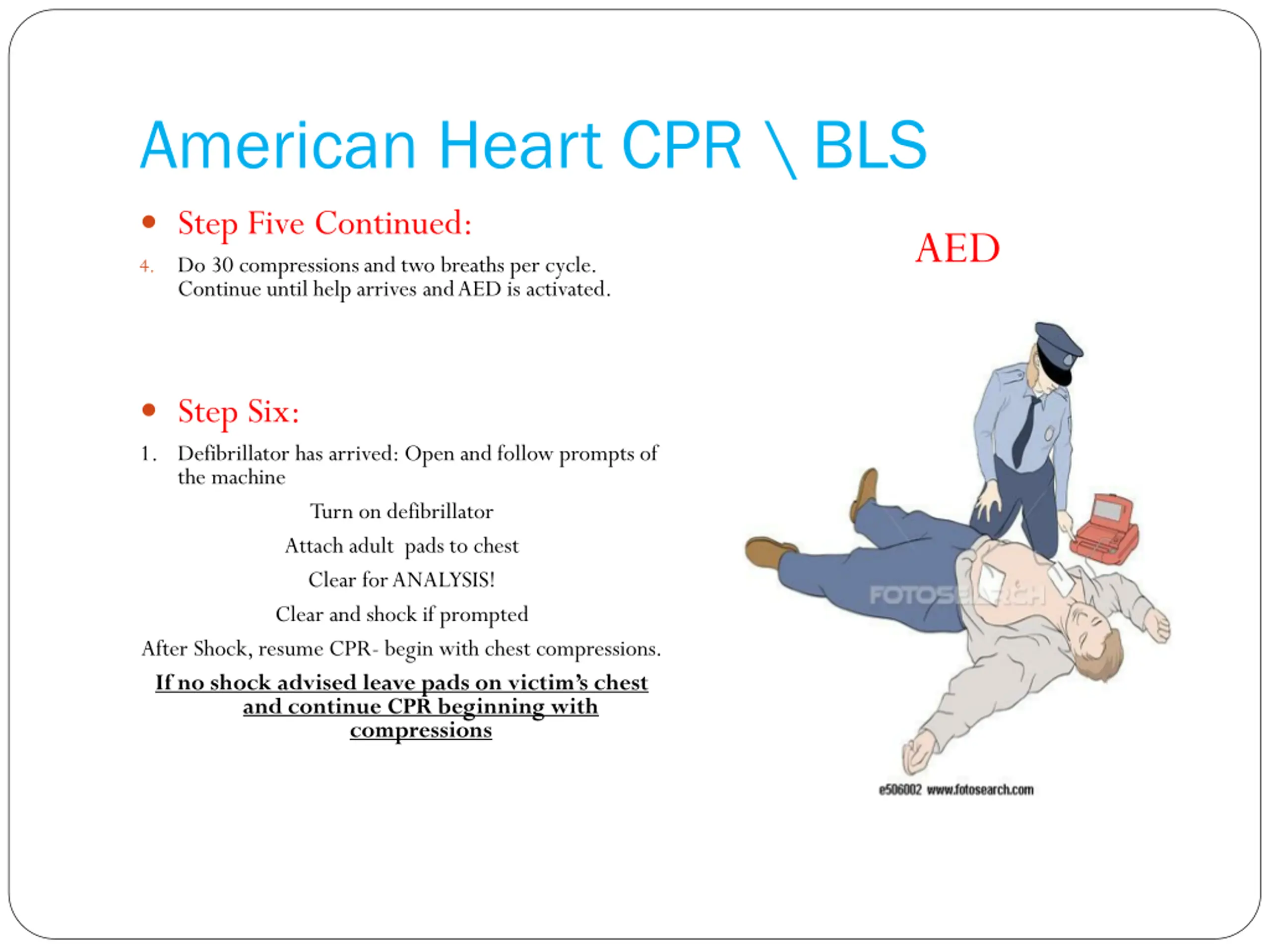 American Heart CPR \ BLS Step Five Continued: 4. Do 30 compressions and two breaths per cycle. Continue until help arrives and AED is activated. AED Step Six: 1. Defibrillator has arrived: Open and follow prompts of the machine Turn on defibrillator Attach adult pads to chest Clear for ANALYSIS! Clear and shock if prompted After Shock, resume CPR- begin with chest compressions. If no shock advised leave pads on victim s chest and continue CPR beginning with compressions