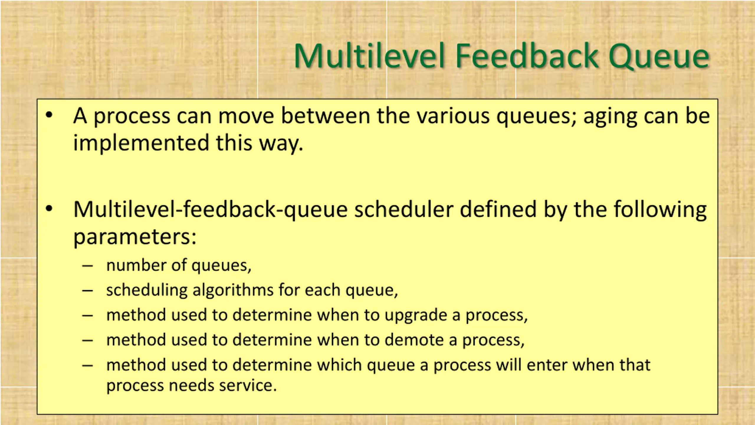 Multilevel Feedback Queue A process can move between the various queues; aging can be implemented this way. Multilevel-feedback-queue scheduler defined by the following parameters: number of queues, scheduling algorithms for each queue, method used to determine when to upgrade a process, method used to determine when to demote a process, method used to determine which queue a process will enter when that process needs service.