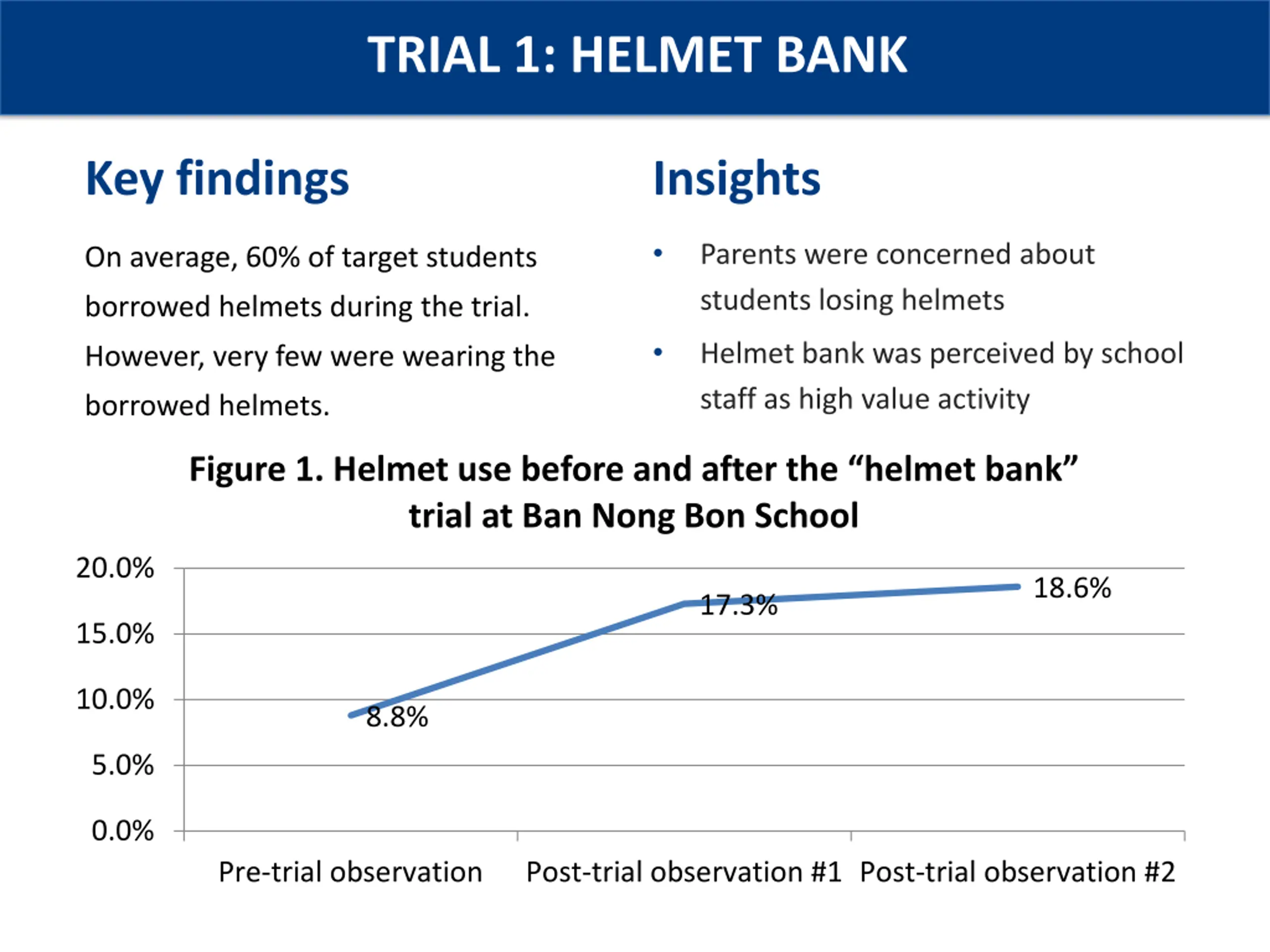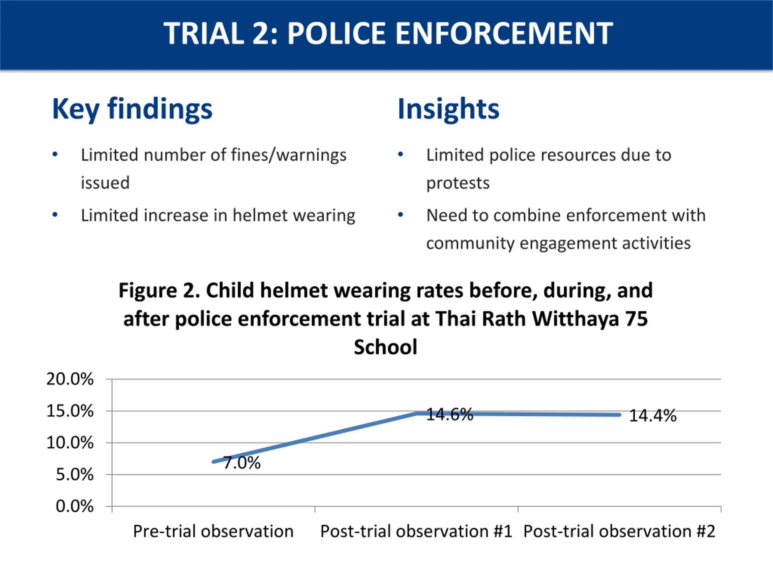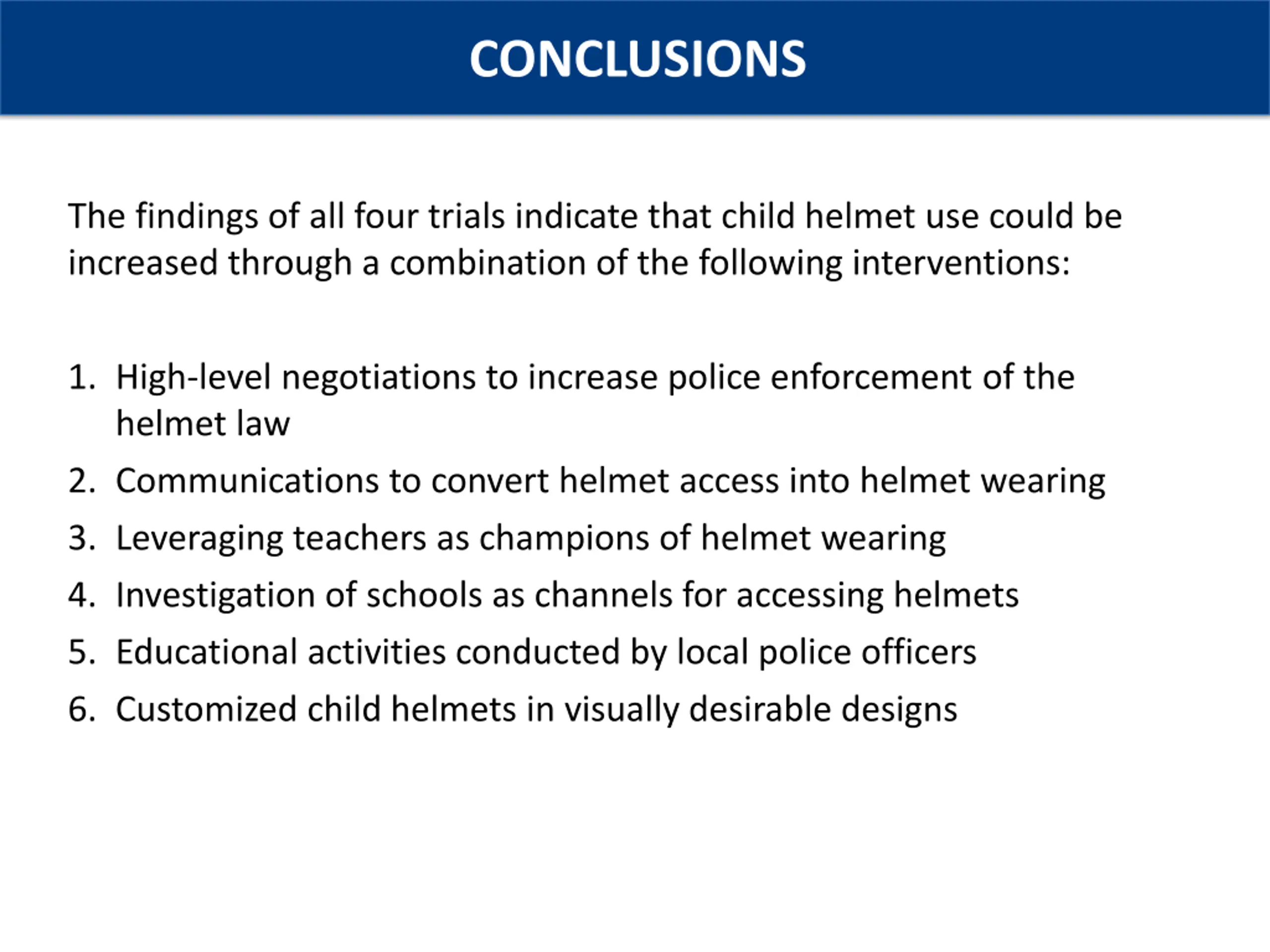 CONCLUSIONS The findings of all four trials indicate that child helmet use could be increased through a combination of the following interventions: 1. High-level negotiations to increase police enforcement of the helmet law 2. Communications to convert helmet access into helmet wearing 3. Leveraging teachers as champions of helmet wearing 4. Investigation of schools as channels for accessing helmets 5. Educational activities conducted by local police officers 6. Customized child helmets in visually desirable designs