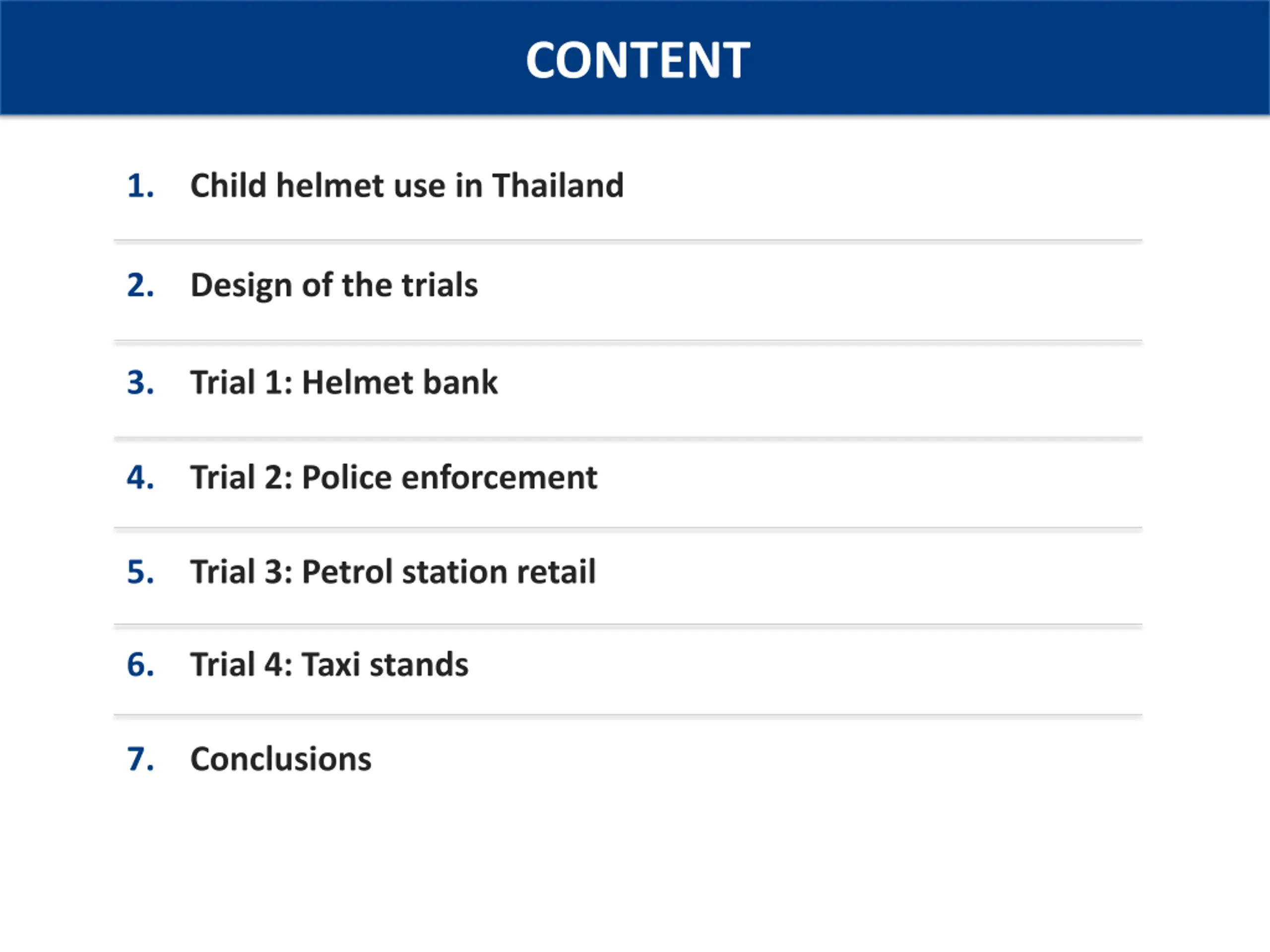 CONTENT 1. Child helmet use in Thailand 2. Design of the trials 3. Trial 1: Helmet bank 4. Trial 2: Police enforcement 5. Trial 3: Petrol station retail 6. Trial 4: Taxi stands 7. Conclusions