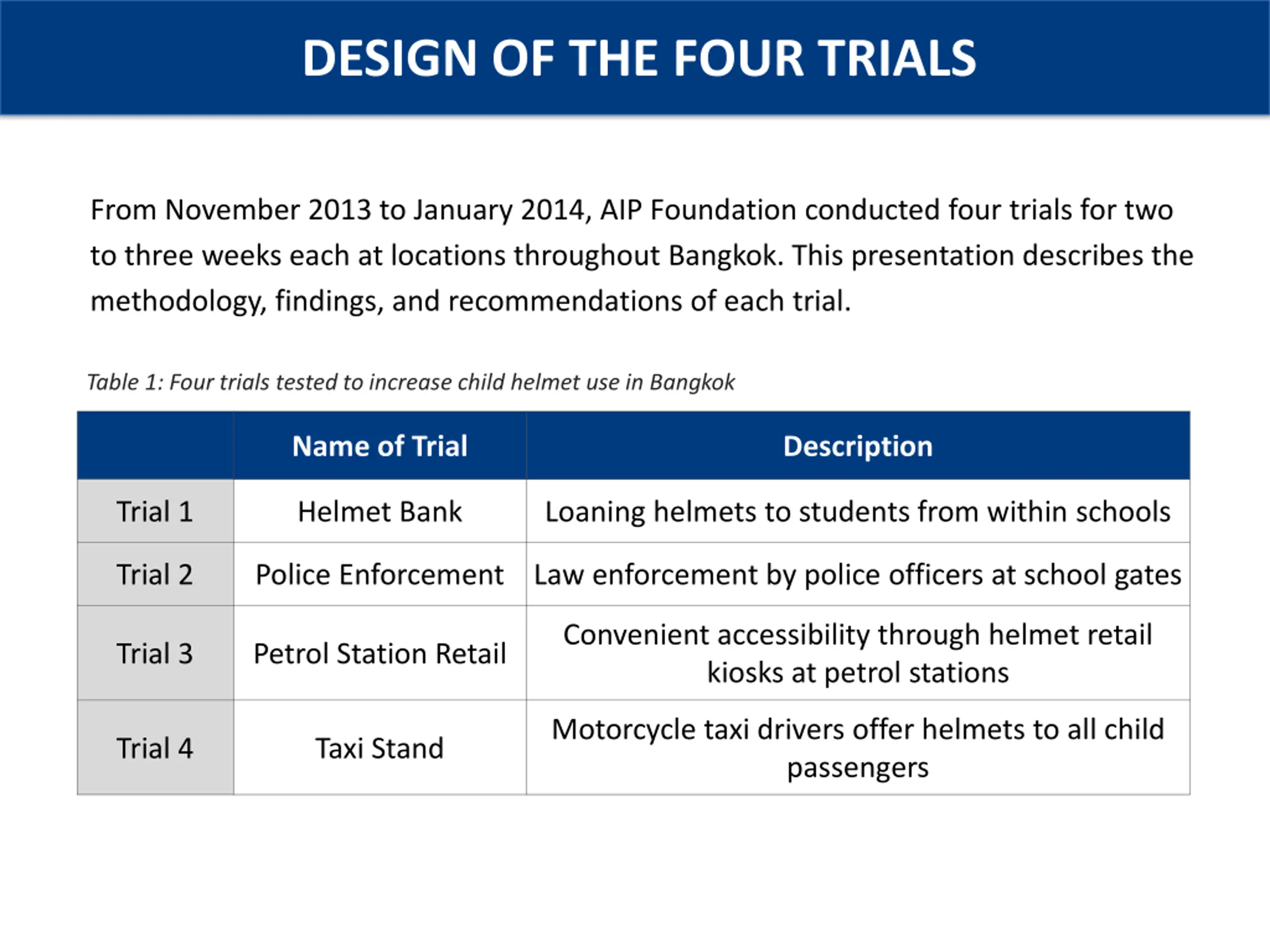 DESIGN OF THE FOUR TRIALS From November 2013 to January 2014, AIP Foundation conducted four trials for two to three weeks each at locations throughout Bangkok. This presentation describes the methodology, findings, and recommendations of each trial. Table 1: Four trials tested to increase child helmet use in Bangkok Name of Trial Description Trial 1 Helmet Bank Loaning helmets to students from within schools Trial 2 Police Enforcement Law enforcement by police officers at school gates Convenient accessibility through helmet retail kiosks at petrol stations Trial 3 Petrol Station Retail Motorcycle taxi drivers offer helmets to all child passengers Trial 4 Taxi Stand