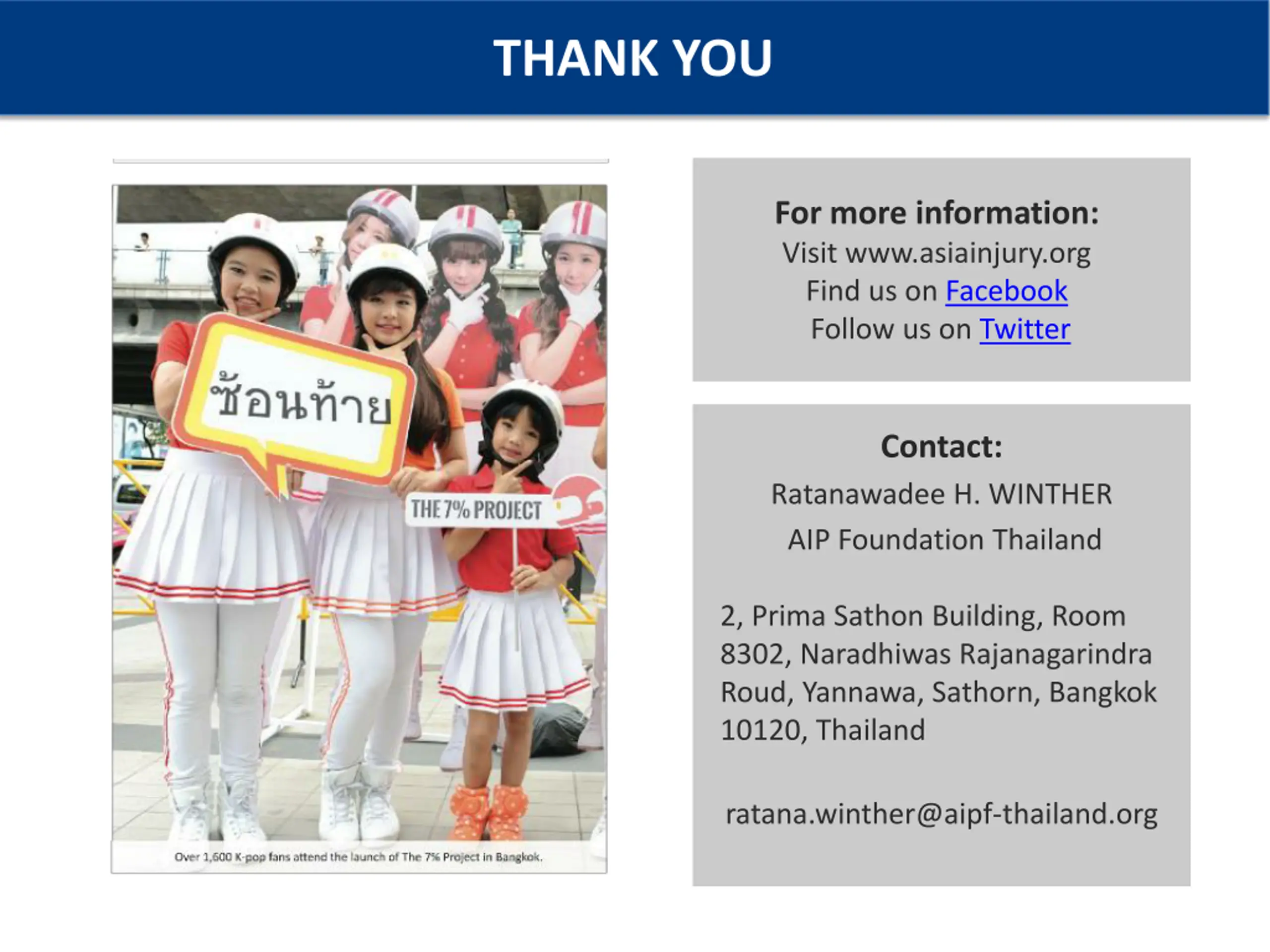 THANK YOU For more information: Visit www.asiainjury.org Find us on Facebook Follow us on Twitter Contact: Ratanawadee H. WINTHER AIP Foundation Thailand 2, Prima Sathon Building, Room 8302, Naradhiwas Rajanagarindra Roud, Yannawa, Sathorn, Bangkok 10120, Thailand ratana.winther@aipf-thailand.org