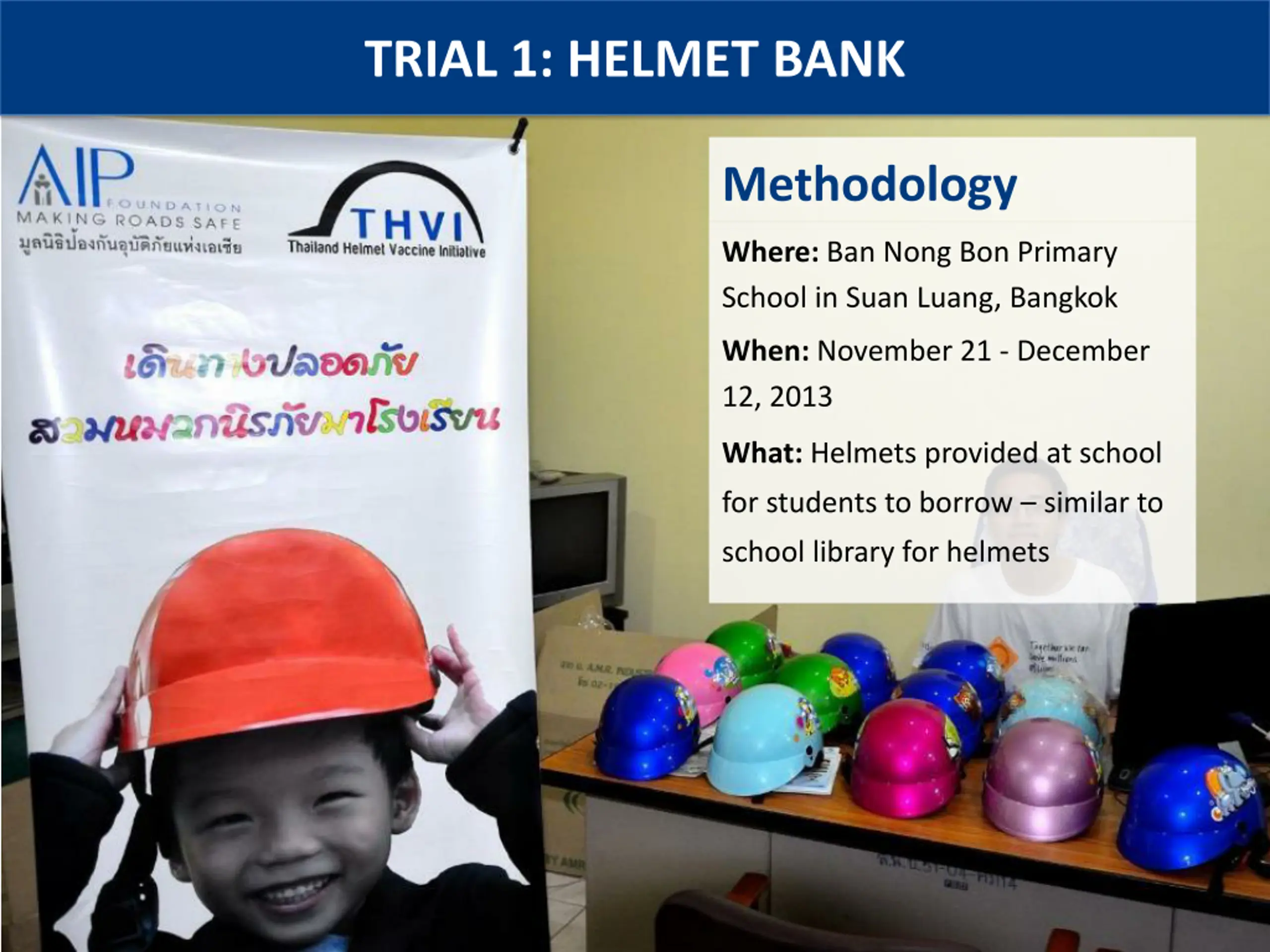 TRIAL 1: HELMET BANK Methodology Where: Ban Nong Bon Primary School in Suan Luang, Bangkok When: November 21 - December 12, 2013 What: Helmets provided at school for students to borrow similar to school library for helmets