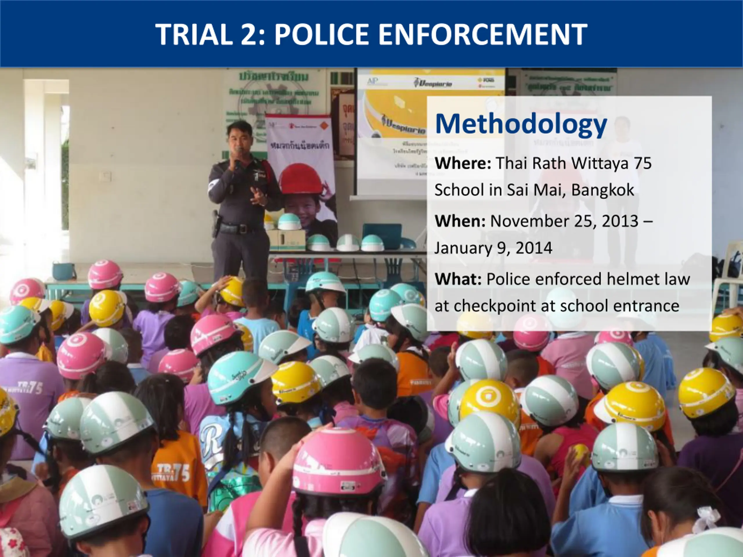 TRIAL 2: POLICE ENFORCEMENT Methodology Where: Thai Rath Wittaya 75 School in Sai Mai, Bangkok When: November 25, 2013 January 9, 2014 What: Police enforced helmet law at checkpoint at school entrance