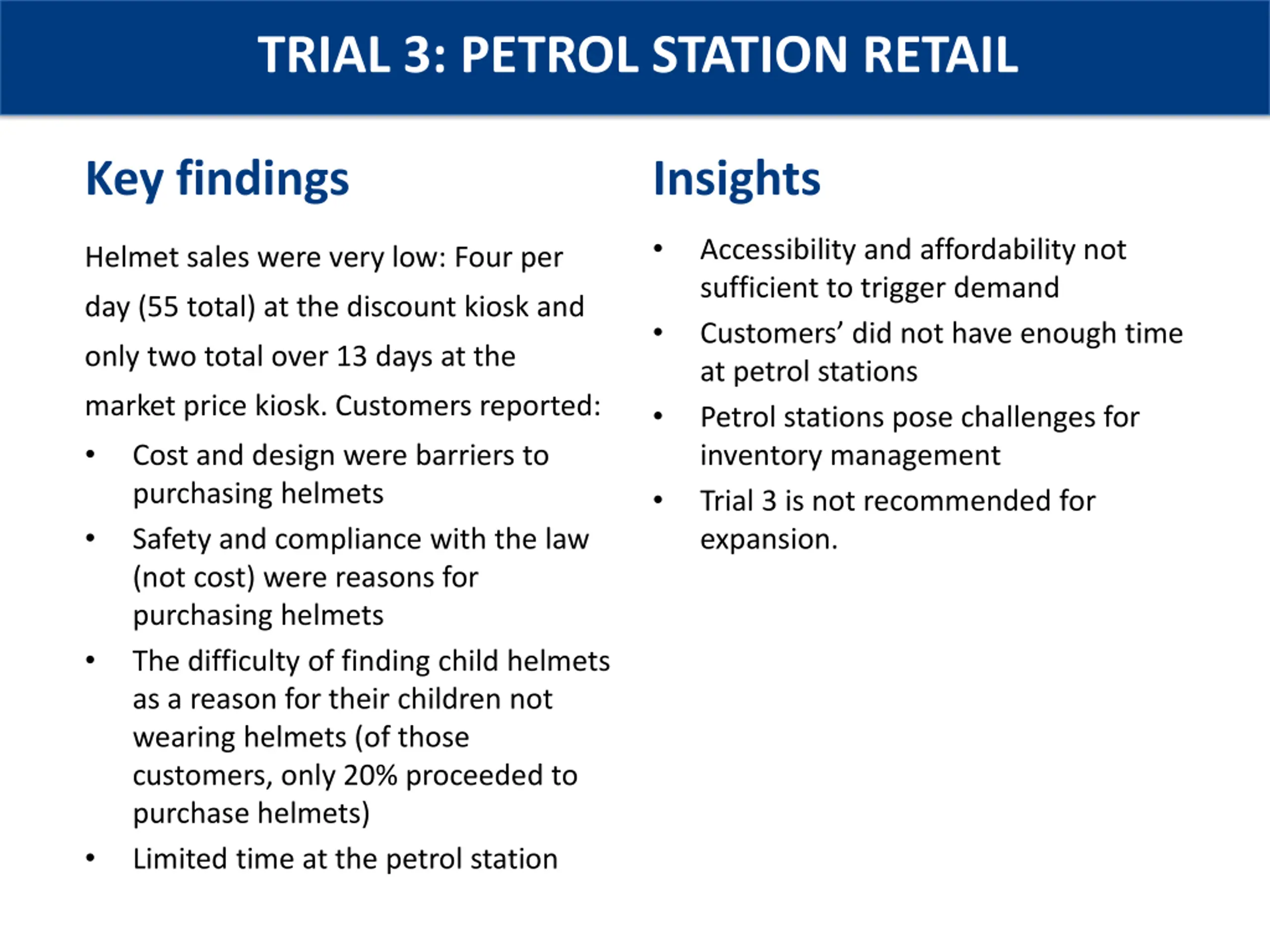 TRIAL 3: PETROL STATION RETAIL Key findings Insights Accessibility and affordability not sufficient to trigger demand Customers did not have enough time at petrol stations Petrol stations pose challenges for inventory management Trial 3 is not recommended for expansion. Helmet sales were very low: Four per day (55 total) at the discount kiosk and only two total over 13 days at the market price kiosk. Customers reported: Cost and design were barriers to purchasing helmets Safety and compliance with the law (not cost) were reasons for purchasing helmets The difficulty of finding child helmets as a reason for their children not wearing helmets (of those customers, only 20% proceeded to purchase helmets) Limited time at the petrol station