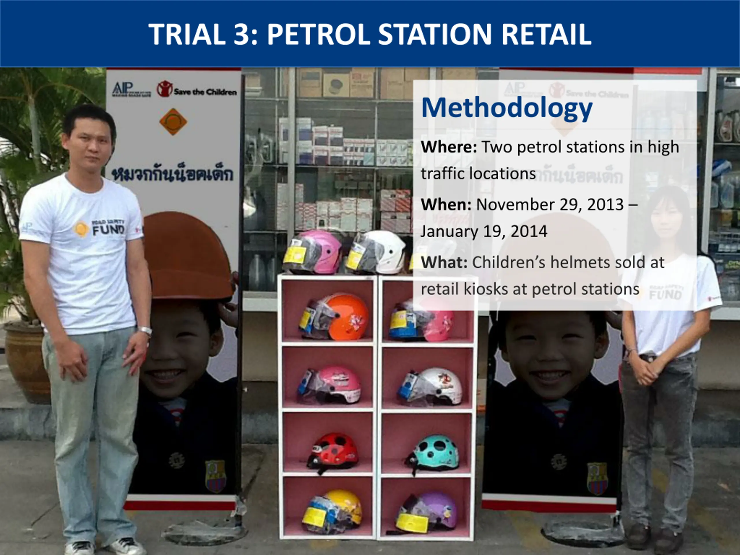 TRIAL 3: PETROL STATION RETAIL Methodology Where: Two petrol stations in high traffic locations When: November 29, 2013 January 19, 2014 What: Children s helmets sold at retail kiosks at petrol stations