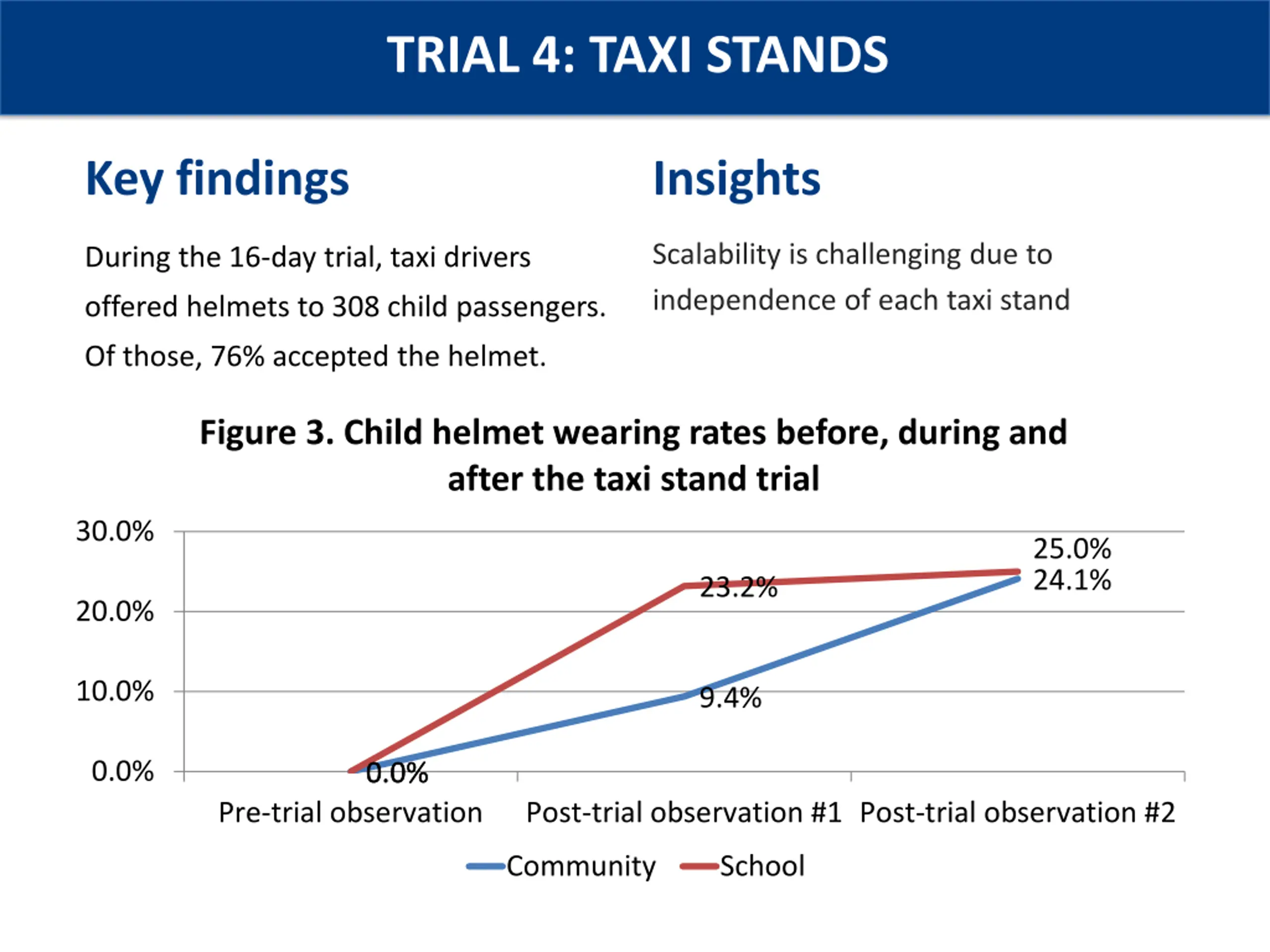 TRIAL 4: TAXI STANDS Key findings Insights Scalability is challenging due to independence of each taxi stand During the 16-day trial, taxi drivers offered helmets to 308 child passengers. Of those, 76% accepted the helmet. Figure 3. Child helmet wearing rates before, during and after the taxi stand trial 30.0% 25.0% 24.1% 23.2% 20.0% 10.0% 9.4% 0.0% 0.0% 0.0% Pre-trial observation Post-trial observation #1 Post-trial observation #2 Community School