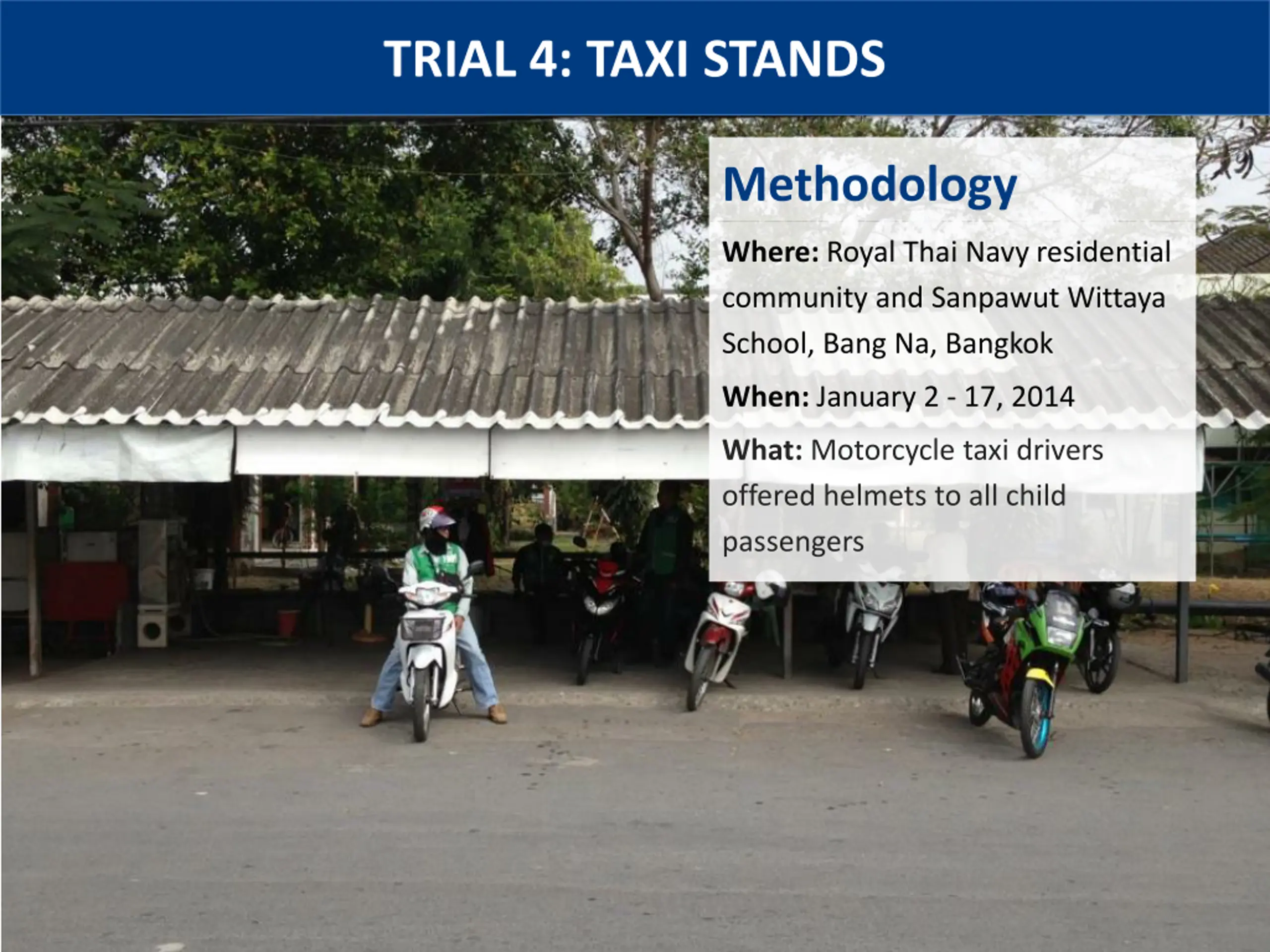 TRIAL 4: TAXI STANDS Methodology Where: Royal Thai Navy residential community and Sanpawut Wittaya School, Bang Na, Bangkok When: January 2 - 17, 2014 What: Motorcycle taxi drivers offered helmets to all child passengers