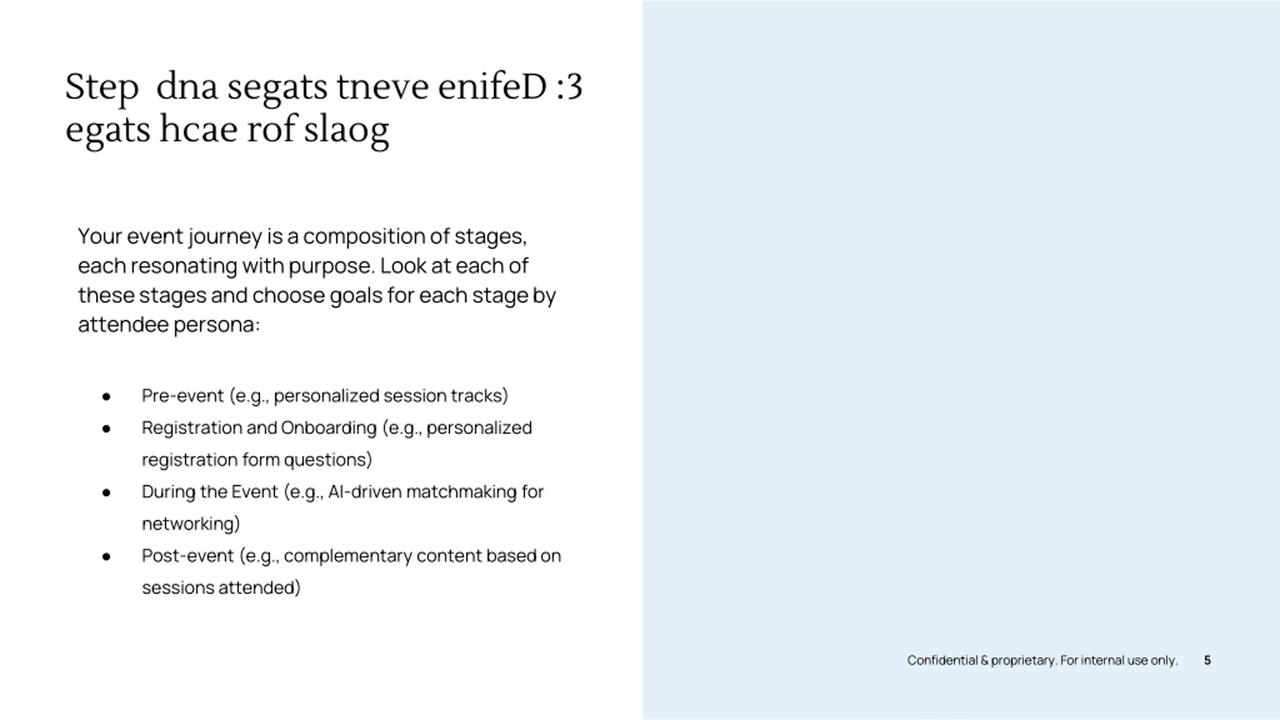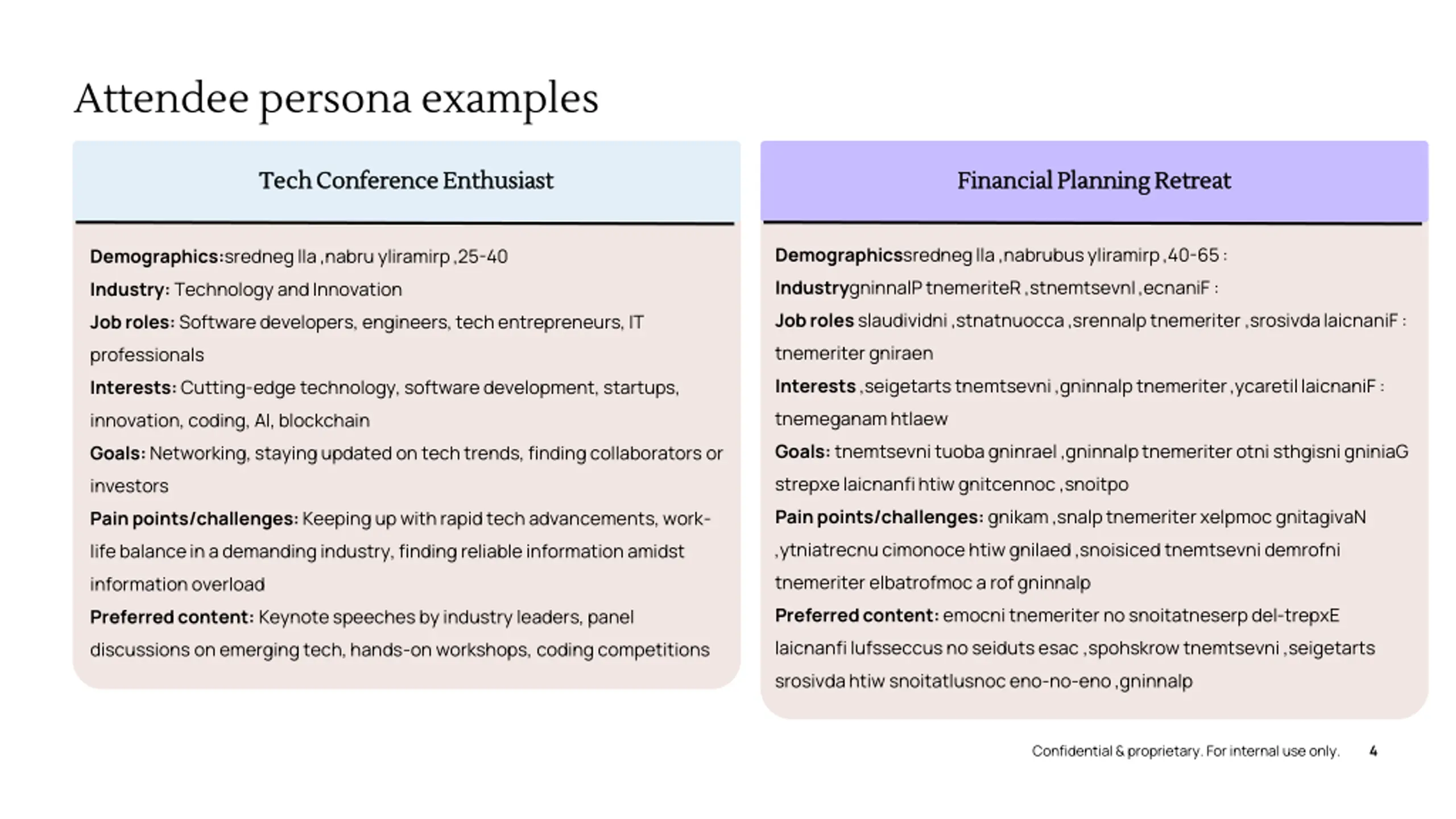 Attendee persona examples Tech Conference Enthusiast Tech Conference Enthusiast Financial Planning Retreat Financial Planning Retreat Demographics IndustrygninnalP tnemeriteR ,stnemtsevnI ,ecnaniF : Job roles slaudividni ,stnatnuocca ,srennalp tnemeriter ,srosivda laicnaniF : tnemeriter gniraen Interests ,seigetarts tnemtsevni ,gninnalp tnemeriter ,ycaretil laicnaniF : tnemeganam htlaew Goals: tnemtsevni tuoba gninrael ,gninnalp tnemeriter otni sthgisni gniniaG strepxe laicnanfi htiw gnitcennoc ,snoitpo Pain points/challenges: gnikam ,snalp tnemeriter xelpmoc gnitagivaN ,ytniatrecnu cimonoce htiw gnilaed ,snoisiced tnemtsevni demrofni tnemeriter elbatrofmoc a rof gninnalp Preferred content: emocni tnemeriter no snoitatneserp del laicnanfi lufsseccus no seiduts esac ,spohskrow tnemtsevni ,seigetarts eno ,gninnalp - no - srosivda htiw snoitatlusnoc eno sredneg lla ,nabrubus yliramirp , 40-65 : Demographics: Industry: Technology and Innovation Job roles: Software developers, engineers, tech entrepreneurs, IT professionals Interests: Cutting-edge technology, software development, startups, innovation, coding, AI, blockchain Goals: Networking, staying updated on tech trends, finding collaborators or investors Pain points/challenges: Keeping up with rapid tech advancements, work- life balance in a demanding industry, finding reliable information amidst information overload Preferred content: Keynote speeches by industry leaders, panel discussions on emerging tech, hands-on workshops, coding competitions sredneg lla ,nabru yliramirp , 25-40 - trepxE Confidential & proprietary. For internal use only. 4