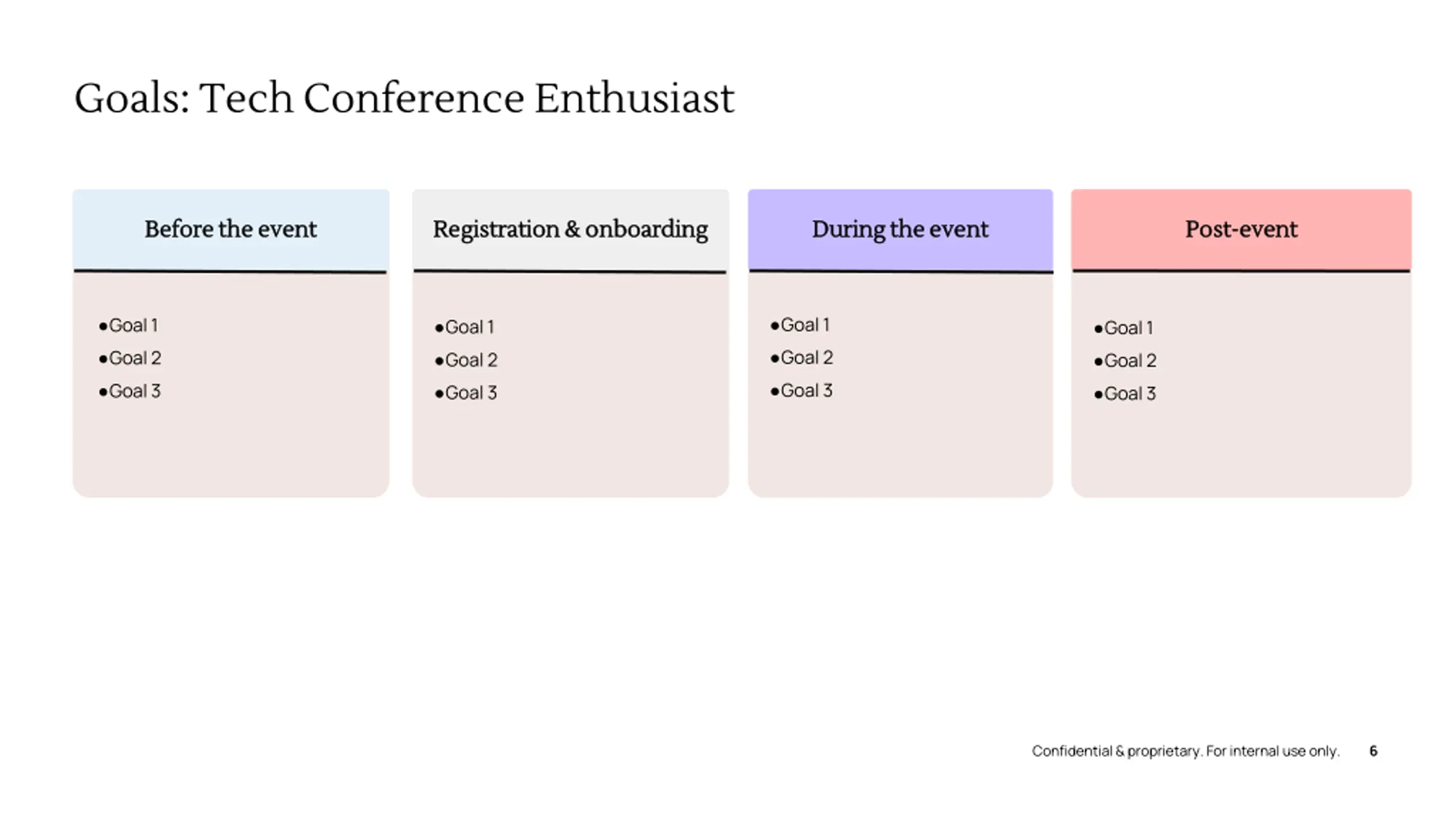 Goals: Tech Conference Enthusiast Before the event Before the event Registration & onboarding Registration & onboarding During the event During the event Post Post- -event event Goal 1 Goal 2 Goal 3 Goal 1 Goal 2 Goal 3 Goal 1 Goal 2 Goal 3 Goal 1 Goal 2 Goal 3 Confidential & proprietary. For internal use only. 6