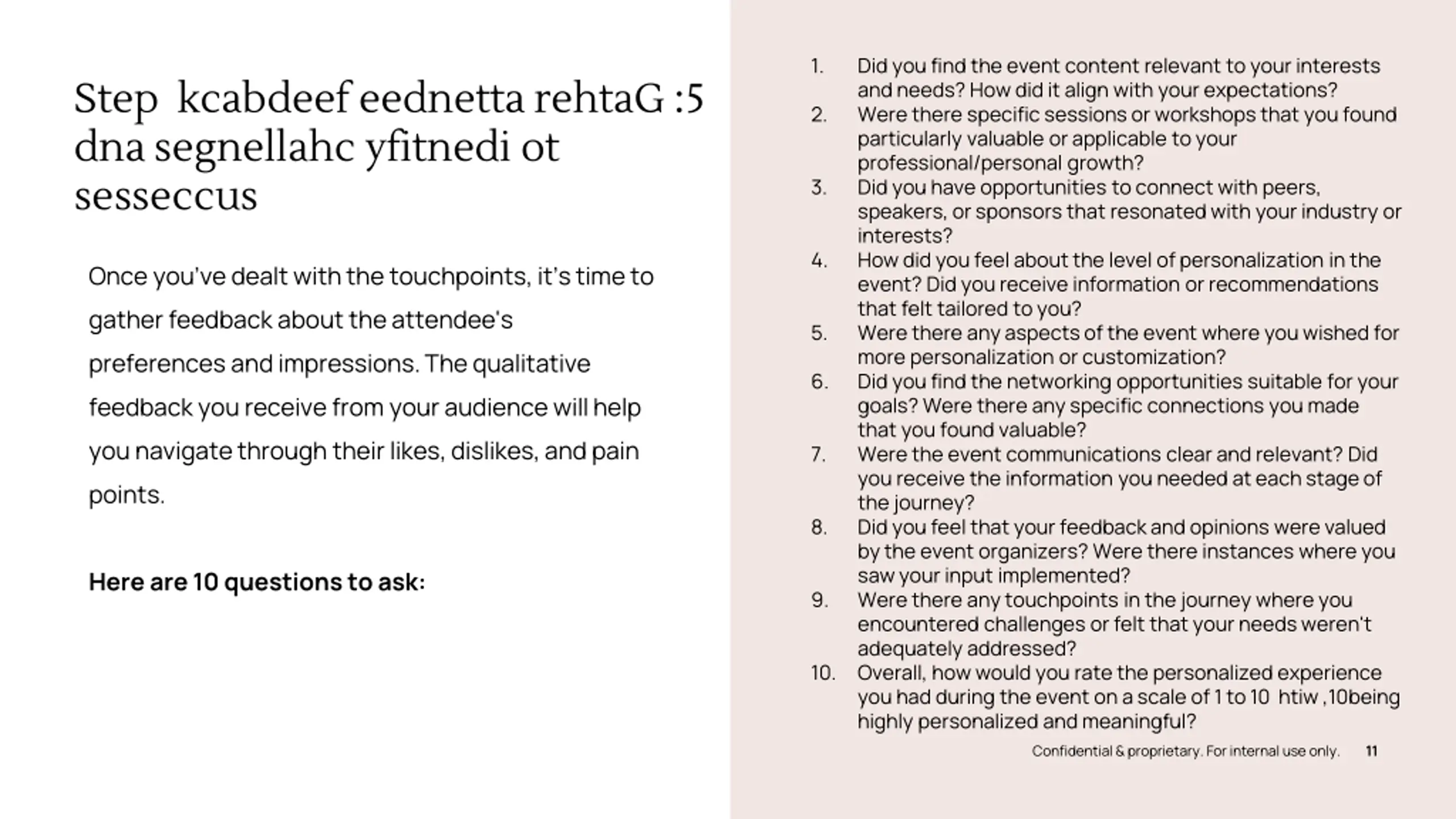 1. Did you find the event content relevant to your interests and needs? How did it align with your expectations? Were there specific sessions or workshops that you found particularly valuable or applicable to your professional/personal growth? Did you have opportunities to connect with peers, speakers, or sponsors that resonated with your industry or interests? How did you feel about the level of personalization in the event? Did you receive information or recommendations that felt tailored to you? Were there any aspects of the event where you wished for more personalization or customization? Did you find the networking opportunities suitable for your goals? Were there any specific connections you made that you found valuable? Were the event communications clear and relevant? Did you receive the information you needed at each stage of the journey? Did you feel that your feedback and opinions were valued by the event organizers? Were there instances where you saw your input implemented? Were there any touchpoints in the journey where you encountered challenges or felt that your needs weren't adequately addressed? Overall, how would you rate the personalized experience you had during the event on a scale of 1 to highly personalized and meaningful? Step dna segnellahc yfitnedi ot sesseccus kcabdeef eednetta rehtaG : 5 2. 3. 4. Once you ve dealt with the touchpoints, it s time to gather feedback about the attendee's preferences and impressions. The qualitative feedback you receive from your audience will help you navigate through their likes, dislikes, and pain points. 5. 6. 7. 8. Here are 10questions to ask: 9. 10. 10 htiw , 10 being Confidential & proprietary. For internal use only. 11
