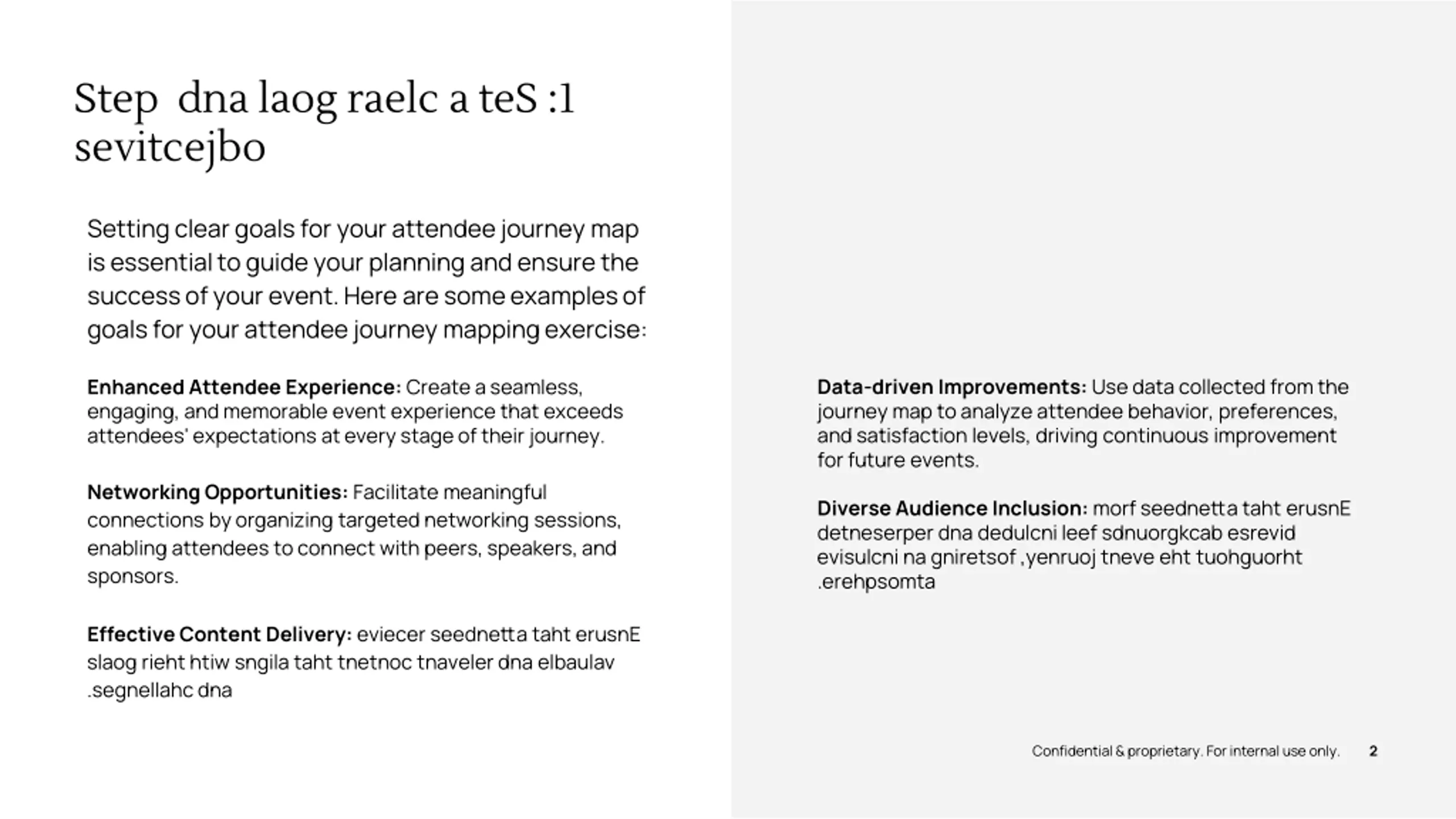Step sevitcejbo dna laog raelc a teS : 1 Setting clear goals for your attendee journey map is essential to guide your planning and ensure the success of your event. Here are some examples of goals for your attendee journey mapping exercise: Data-driven Improvements: Use data collected from the journey map to analyze attendee behavior, preferences, and satisfaction levels, driving continuous improvement for future events. Enhanced Attendee Experience: Create a seamless, engaging, and memorable event experience that exceeds attendees' expectations at every stage of their journey. Networking Opportunities: Facilitate meaningful connections by organizing targeted networking sessions, enabling attendees to connect with peers, speakers, and sponsors. Diverse Audience Inclusion: morf seednetta taht erusnE detneserper dna dedulcni leef sdnuorgkcab esrevid evisulcni na gniretsof ,yenruoj tneve eht tuohguorht erehpsomta . Effective Content Delivery: eviecer seednetta taht erusnE slaog rieht htiw sngila taht tnetnoc tnaveler dna elbaulav segnellahc dna . Confidential & proprietary. For internal use only. 2