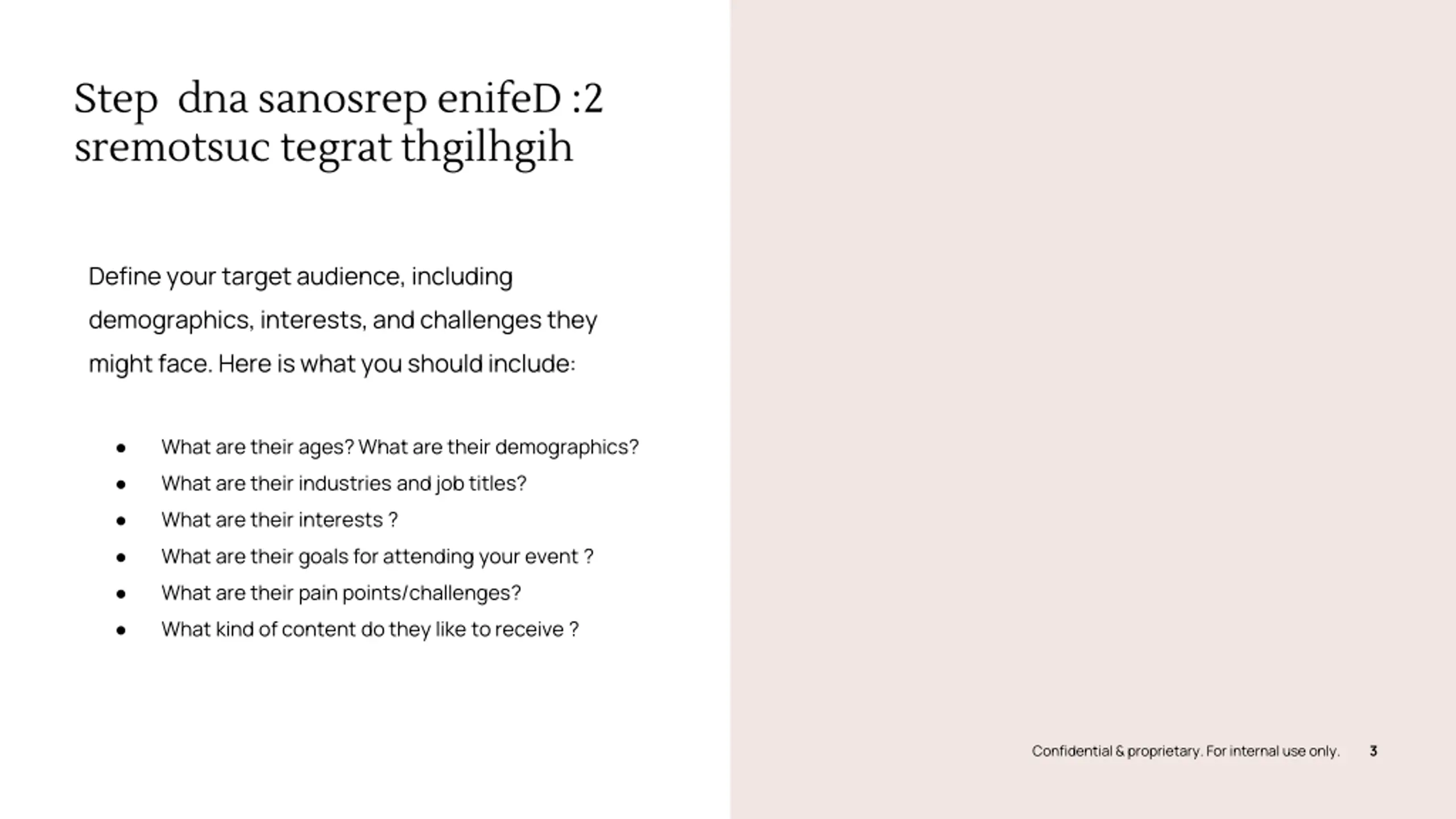 Step sremotsuc tegrat thgilhgih dna sanosrep enifeD : 2 Define your target audience, including demographics, interests, and challenges they might face. Here is what you should include: What are their ages? What are their demographics? What are their industries and job titles? What are their interests ? What are their goals for attending your event ? What are their pain points/challenges? What kind of content do they like to receive ? Confidential & proprietary. For internal use only. 3