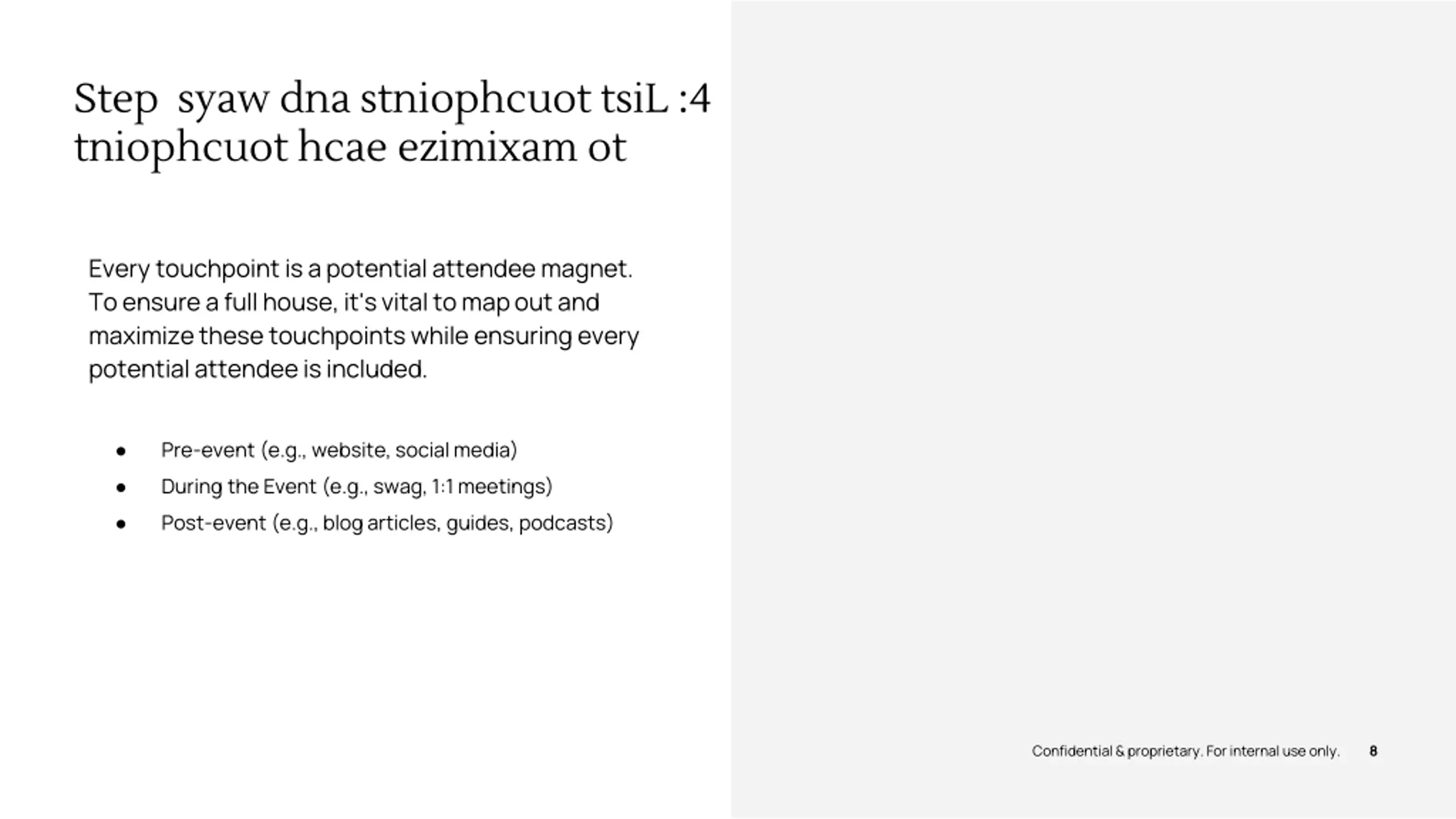 Step tniophcuot hcae ezimixam ot syaw dna stniophcuot tsiL : 4 Every touchpoint is a potential attendee magnet. To ensure a full house, it's vital to map out and maximize these touchpoints while ensuring every potential attendee is included. Pre-event (e.g., website, social media) During the Event (e.g., swag, 1:1 meetings) Post-event (e.g., blog articles, guides, podcasts) Confidential & proprietary. For internal use only. 8