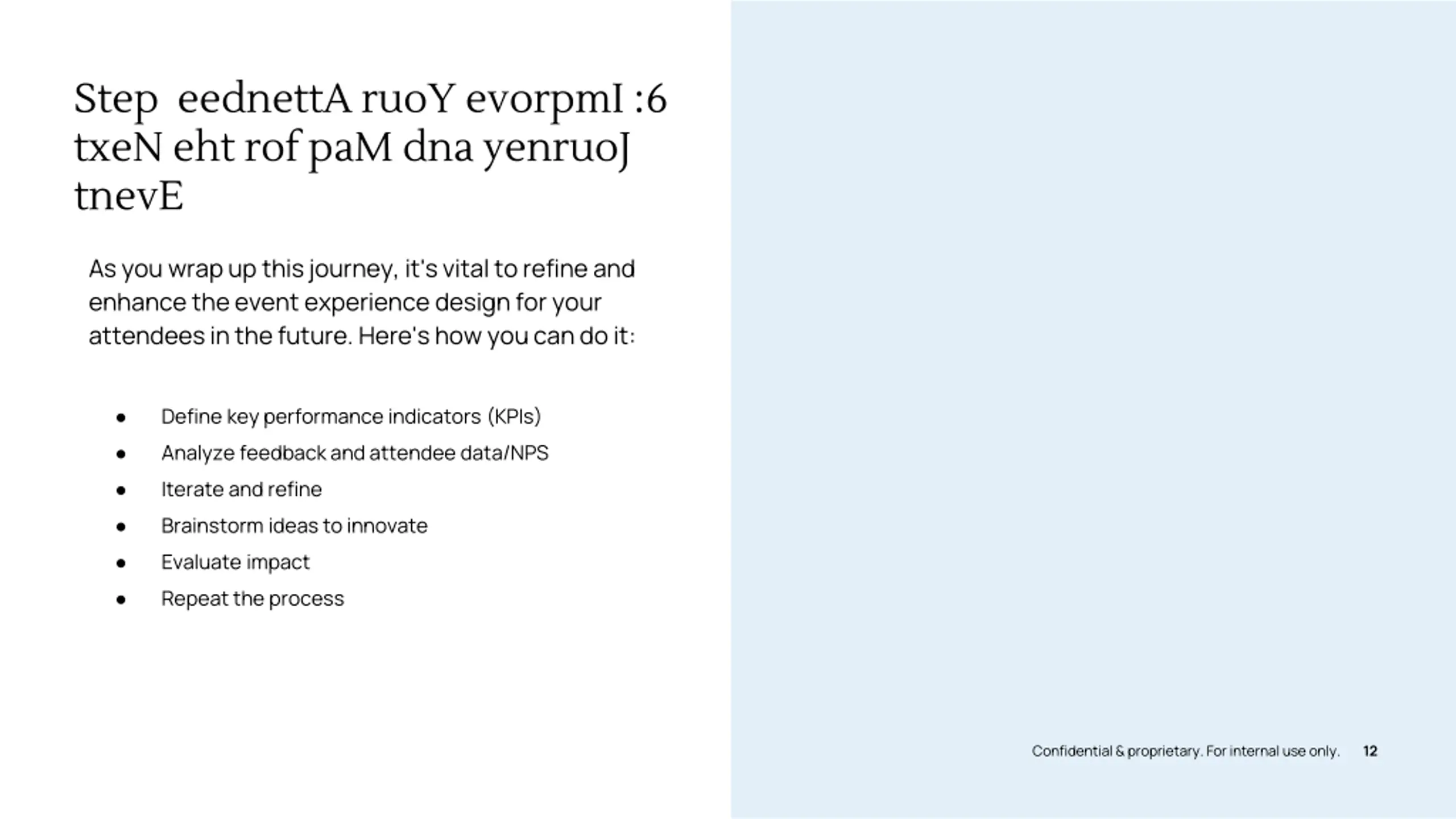Step txeN eht rof paM dna yenruoJ tnevE eednettA ruoY evorpmI : 6 As you wrap up this journey, it's vital to refine and enhance the event experience design for your attendees in the future. Here's how you can do it: Define key performance indicators (KPIs) Analyze feedback and attendee data/NPS Iterate and refine Brainstorm ideas to innovate Evaluate impact Repeat the process Confidential & proprietary. For internal use only. 12