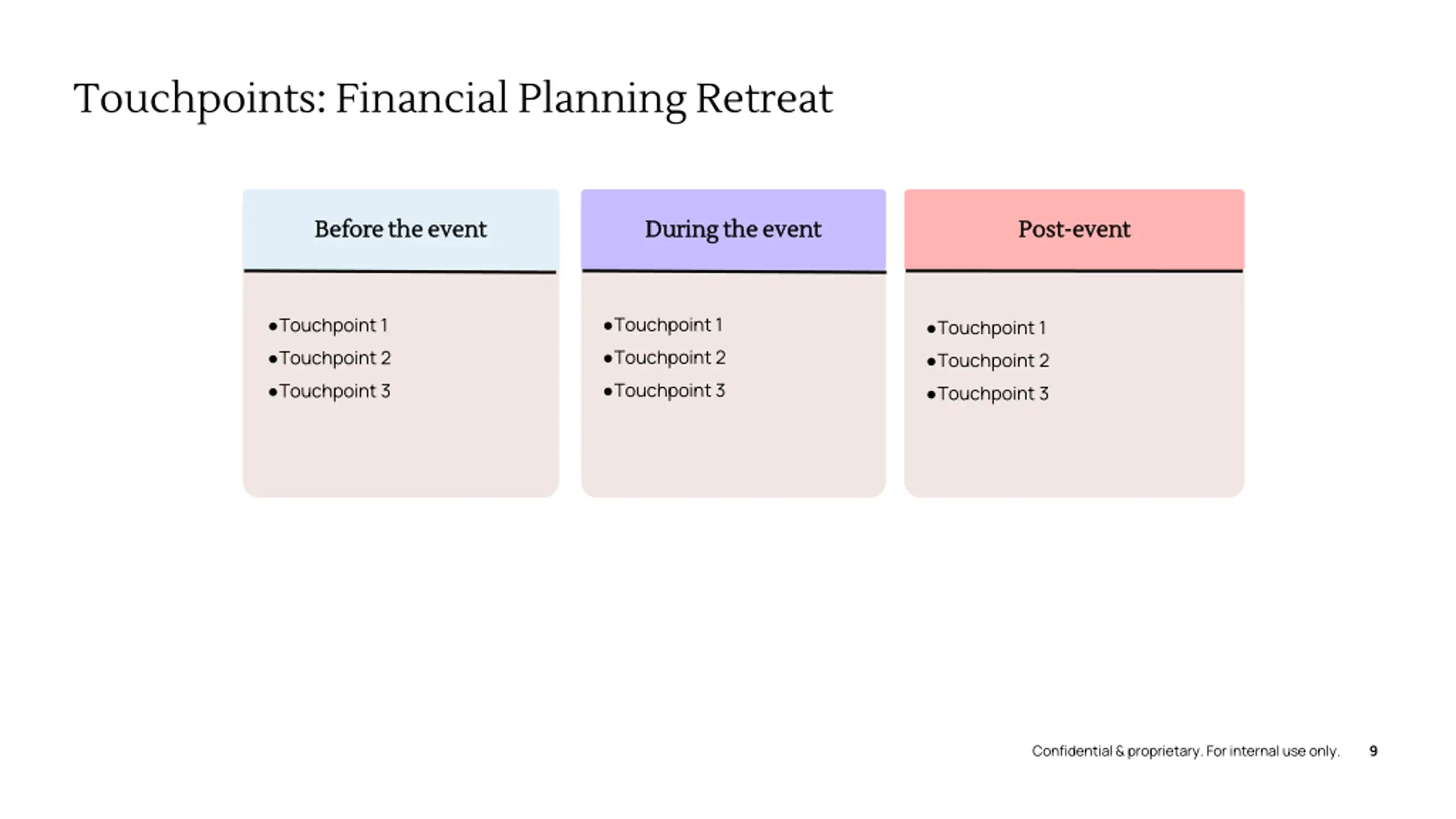 Touchpoints: Financial Planning Retreat Before the event Before the event During the event During the event Post Post- -event event Touchpoint 1 Touchpoint 2 Touchpoint 3 Touchpoint 1 Touchpoint 2 Touchpoint 3 Touchpoint 1 Touchpoint 2 Touchpoint 3 Confidential & proprietary. For internal use only. 9