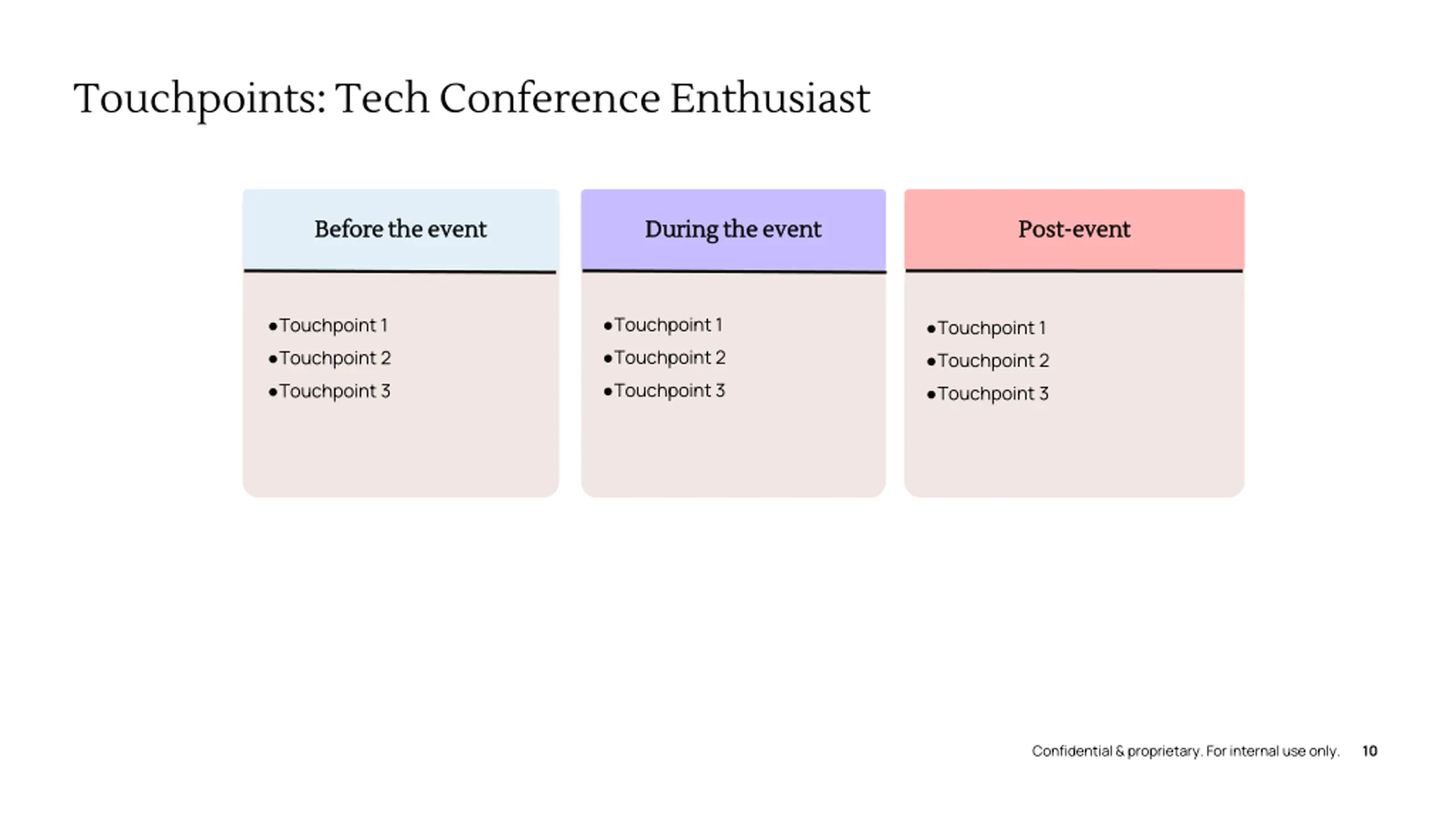 Touchpoints: Tech Conference Enthusiast Before the event Before the event During the event During the event Post Post- -event event Touchpoint 1 Touchpoint 2 Touchpoint 3 Touchpoint 1 Touchpoint 2 Touchpoint 3 Touchpoint 1 Touchpoint 2 Touchpoint 3 Confidential & proprietary. For internal use only. 10