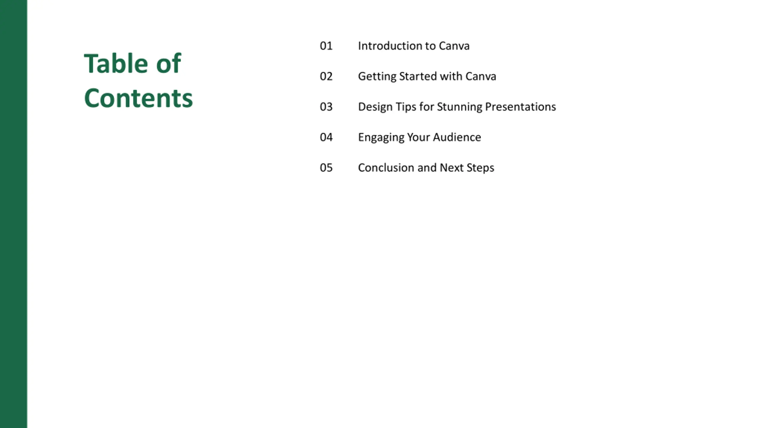 01 Introduction to Canva Table of Contents 02 Getting Started with Canva 03 Design Tips for Stunning Presentations 04 Engaging Your Audience 05 Conclusion and Next Steps