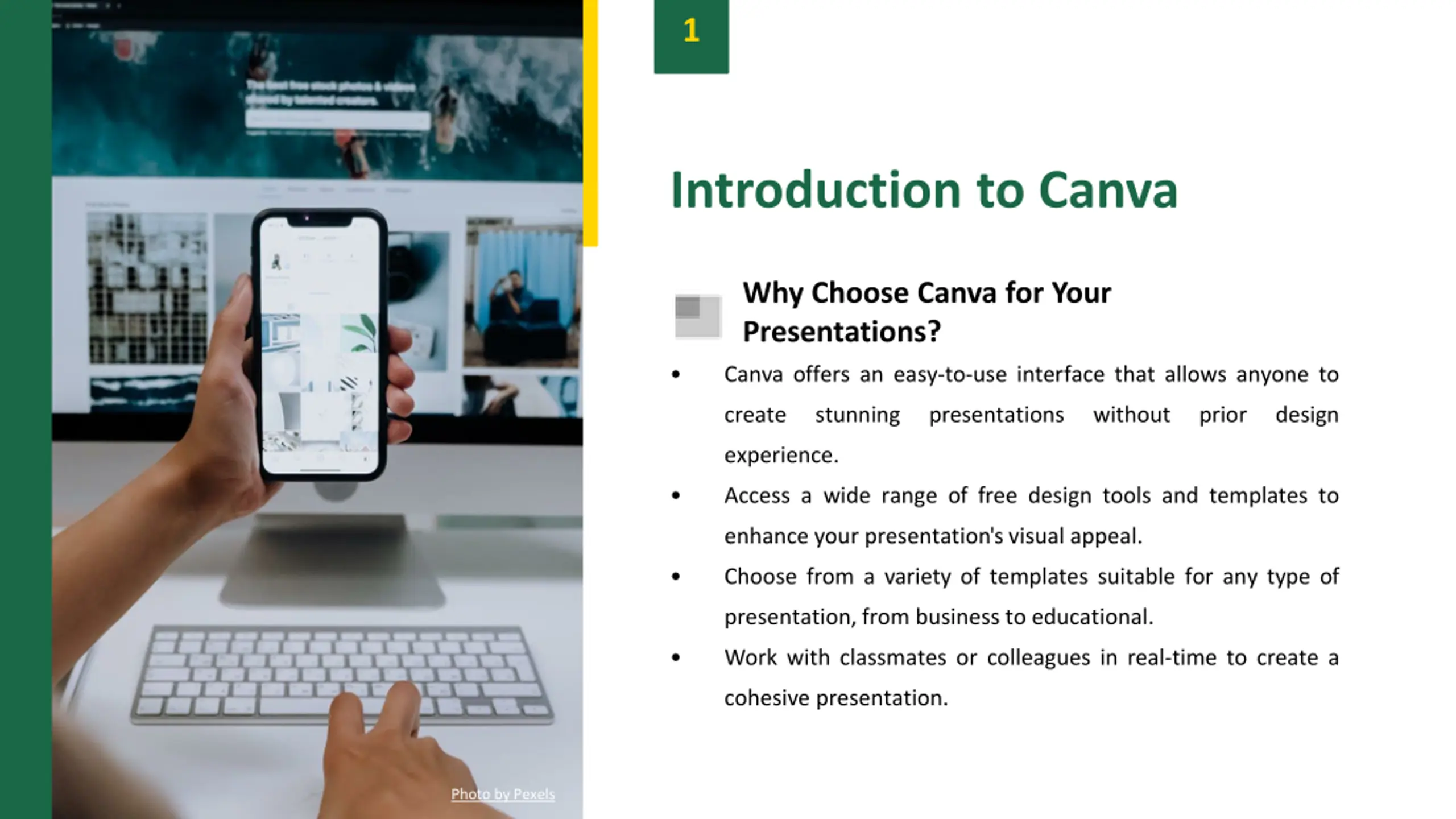 1 Introduction to Canva Why Choose Canva for Your Presentations? Canva offers an easy-to-use interface that allows anyone to create stunning presentations without prior design experience. Access a wide range of free design tools and templates to enhance your presentation's visual appeal. Choose from a variety of templates suitable for any type of presentation, from business to educational. Work with classmates or colleagues in real-time to create a cohesive presentation. Photo by Pexels