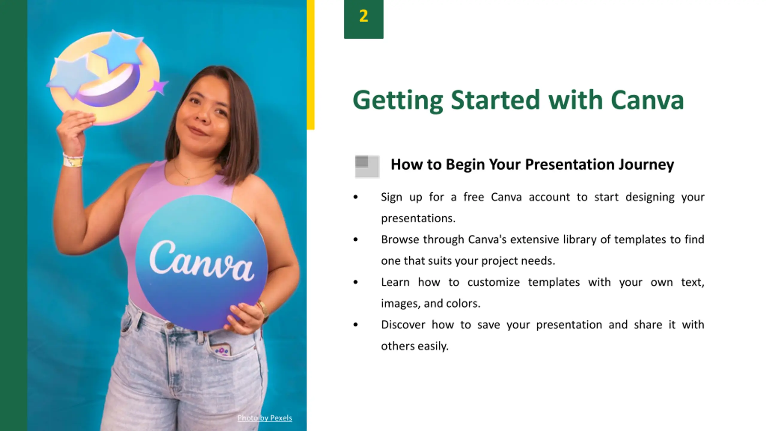 2 Getting Started with Canva How to Begin Your Presentation Journey Sign up for a free Canva account to start designing your presentations. Browse through Canva's extensive library of templates to find one that suits your project needs. Learn how to customize templates with your own text, images, and colors. Discover how to save your presentation and share it with others easily. Photo by Pexels